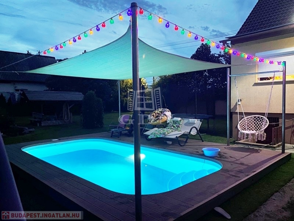 Az 1 éves feltekerhető ponyvás 25m2 kibetonozott, műanyag testű medence, víz alatti világítással, WPC burkolattal, teljes gépészettel,10 kW hőszivattyús fűtésssel,10 kW Solár fűtéssel, összesen 20 kW fűtőteljesítménnyel, krómozott Solari kerti zuhanyzóval várja új tulajdonosát!
