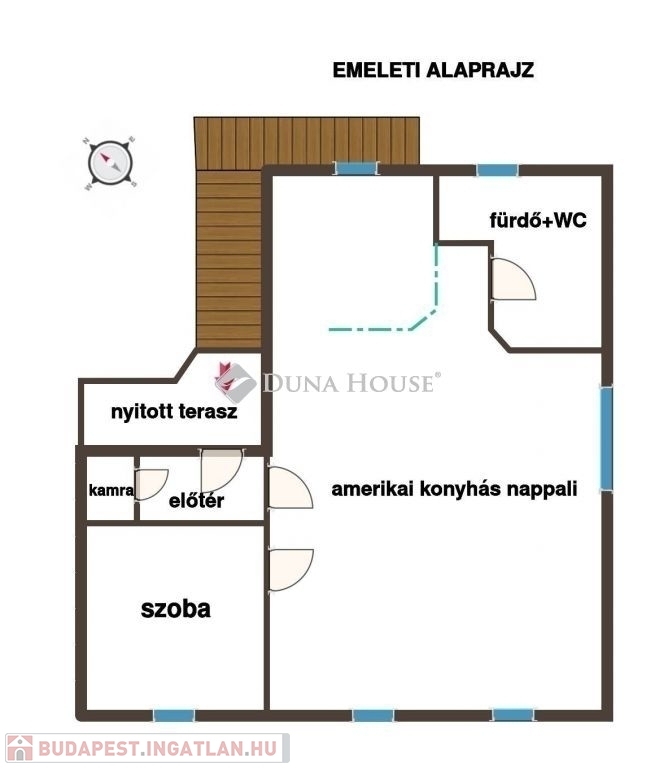 - az emeleten amerikai konyhás nappali + 1 szoba, fürdő WC vel, előtér és kamra elosztású.