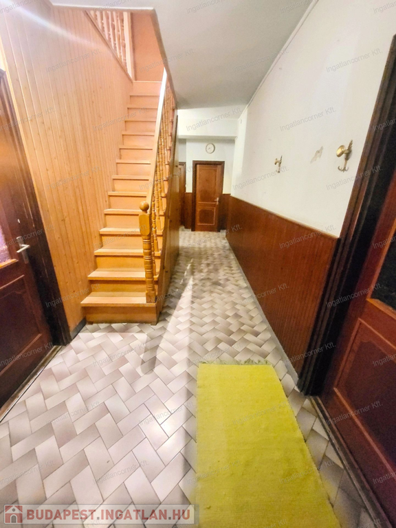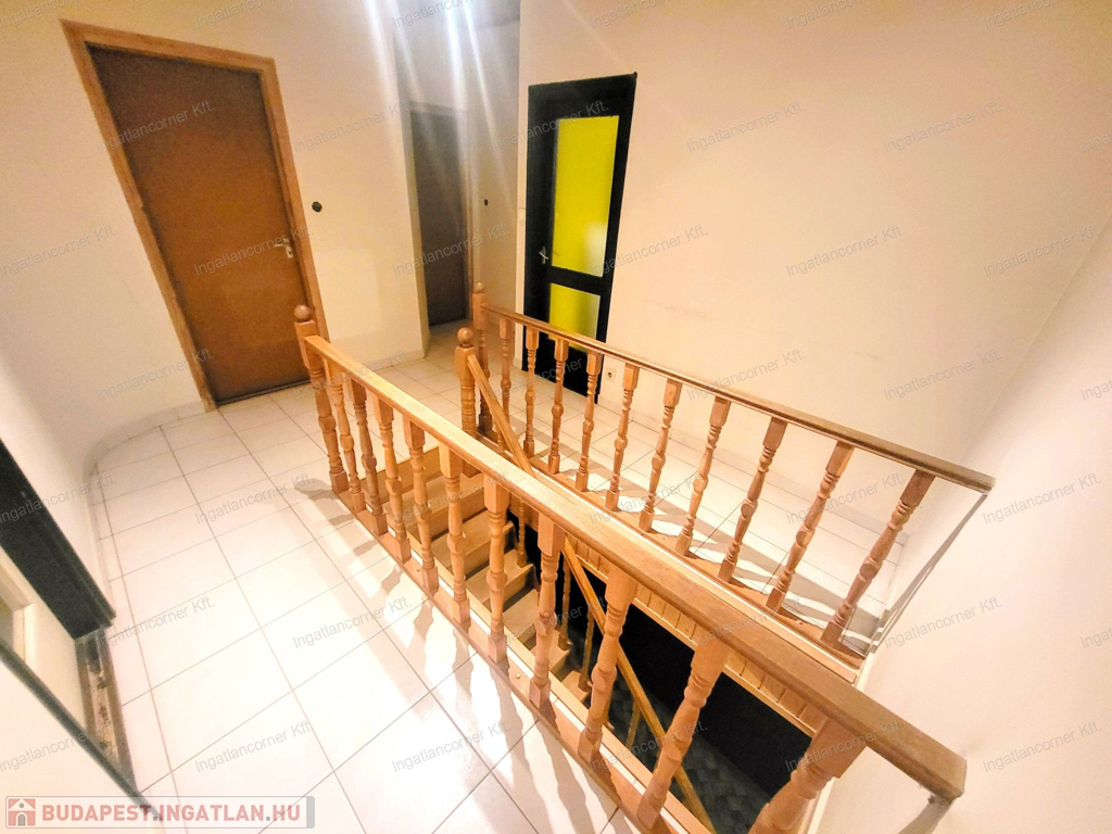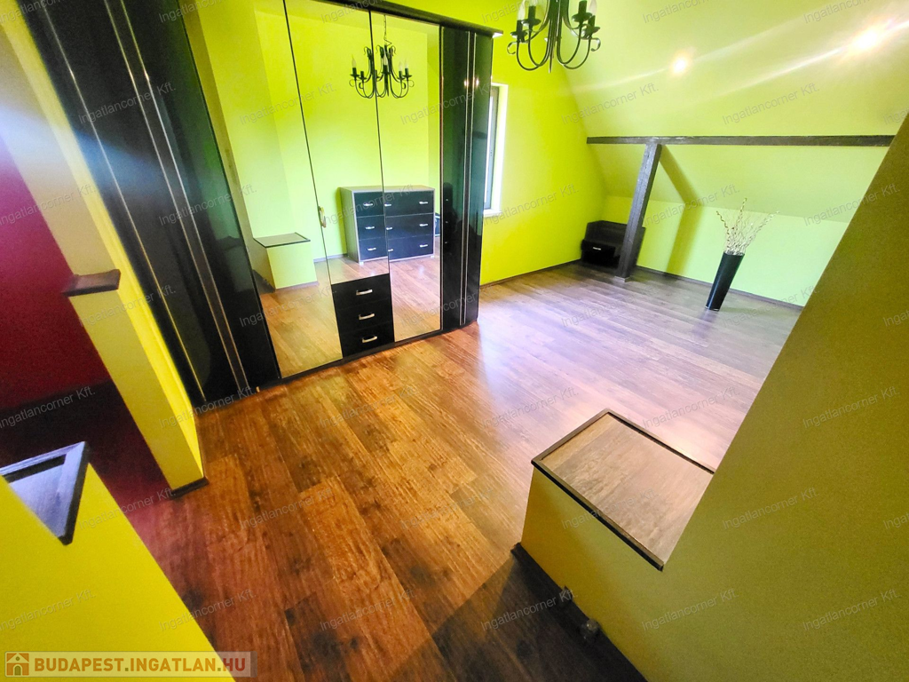 az EMELET: 54,3 m² nettó alapterületű: elosztása kiváló: a lépcsőn felérve egy 5m2-es közlekedőből nyílik, két külön nyíló hatalmas méretű szoba, melynek a nettó lapterülete: 22,4m2 és 18,30m2, melyek igény esetén tovább osztható több helyiségre. A képeken pirosra festett szobában a vizesblokk is felhúzásra került a földszintről, agy akár egy külön konyhának is kialakítható. Továbbá egy külön WC és fürdő helyiség is megtalálható, ahol a vizes blokkok ugyan kialakításra került, de ennek valós kialakítása már az új tulajdonosra vár.
