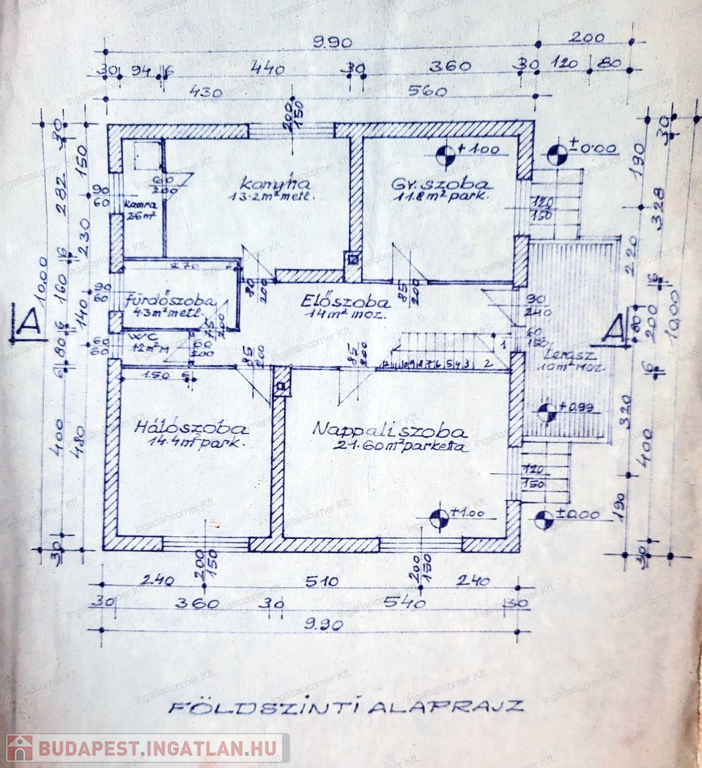 A nettó 137,4m2 lakótérből az ALSÓ SZINT: 83,1m2 (melynek az elosztása: tágas előszoba 14m2, ahol a cipők kabátok kényelmesen elhelyezhetőek, továbbá ebből a térből érhető el kényelmes falépcsőkön keresztül az emeleti szint, balra a tágas 21,60m2-es nappali és két igen jó méretű hálószoba (14,4m2, 11,8m2-rel) egy külön mellékhelyiség (1,2m2) egy káddal felszerelt fürdőszoba, és egy különálló ablakkal rendelkező 13,2m2-es konyha-étkező, melyből egy 2,6m2-es kamra is leválasztásra került)