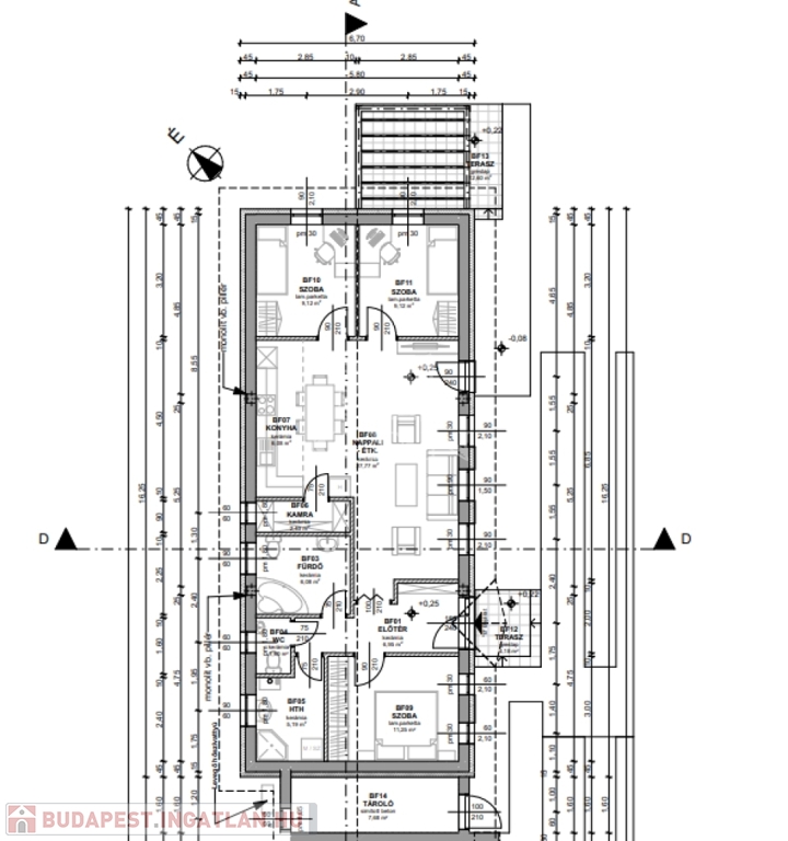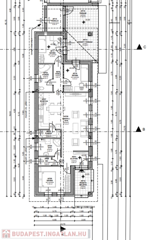 Helyiségei: nappali/étkező 27,00 m2, szoba 11,25 m2, szoba 9,12 m2, szoba 9,12 m2, konyha 5,25 m2, fürdő szoba 5,28 m2, közlekedő 3,52 m2, előtér 6,06 m2, kamra 2,34 m2, wc 1,50 m2, hth 5,20 m2, fedett belépő 5,48 m2 fedett terasz 11,79 m2, terasz 11,40 m2, tároló 5,55 m2.