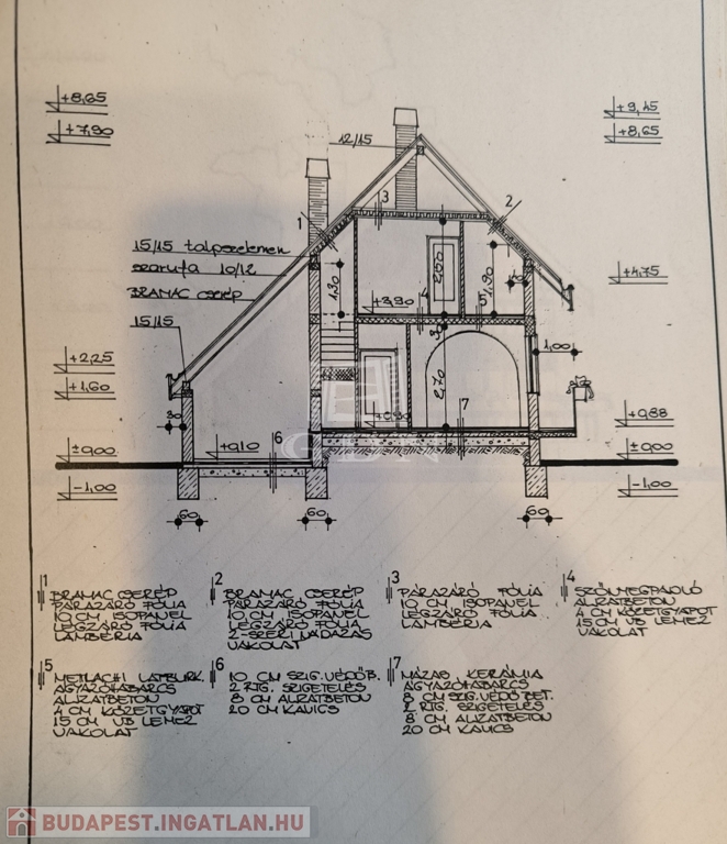 A ház 1987-ben beton sávalapra épült 30-as téglából, a tető héjalása Bramac betoncserép. A tető fújható kőzetgyapot szigetelést kapott,