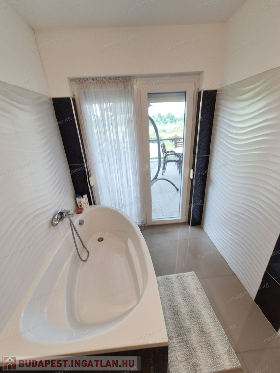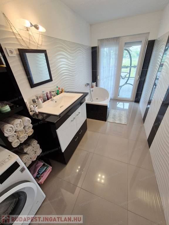 -szép nagyméretű FÜRDŐSZOBA (8m2) zárja a sort, ahol a mosógép-szárítógép könnyen elfér, illetve egy aszimmetrikus kád, amely kifejezetten úgy épült, hogy a kádból a CSODÁS DUNAI PANORÁMA tárul ön elé.