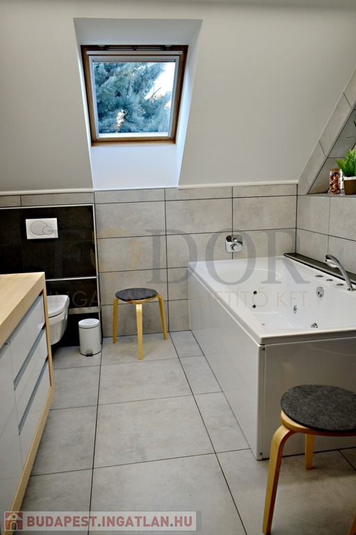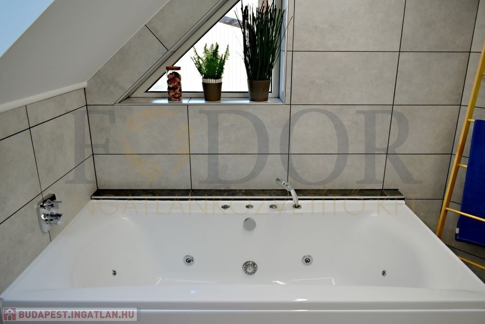 • Fürdő mindkét szinten: alul épített zuhany és bidés WC, felül hidromasszázskád víz- és levegőfúvókákkal, igazi wellness-élmény otthon.