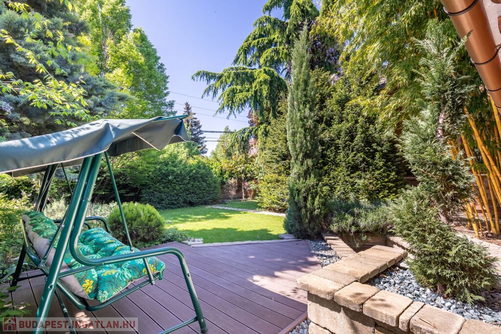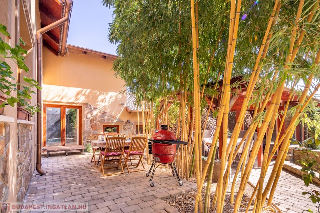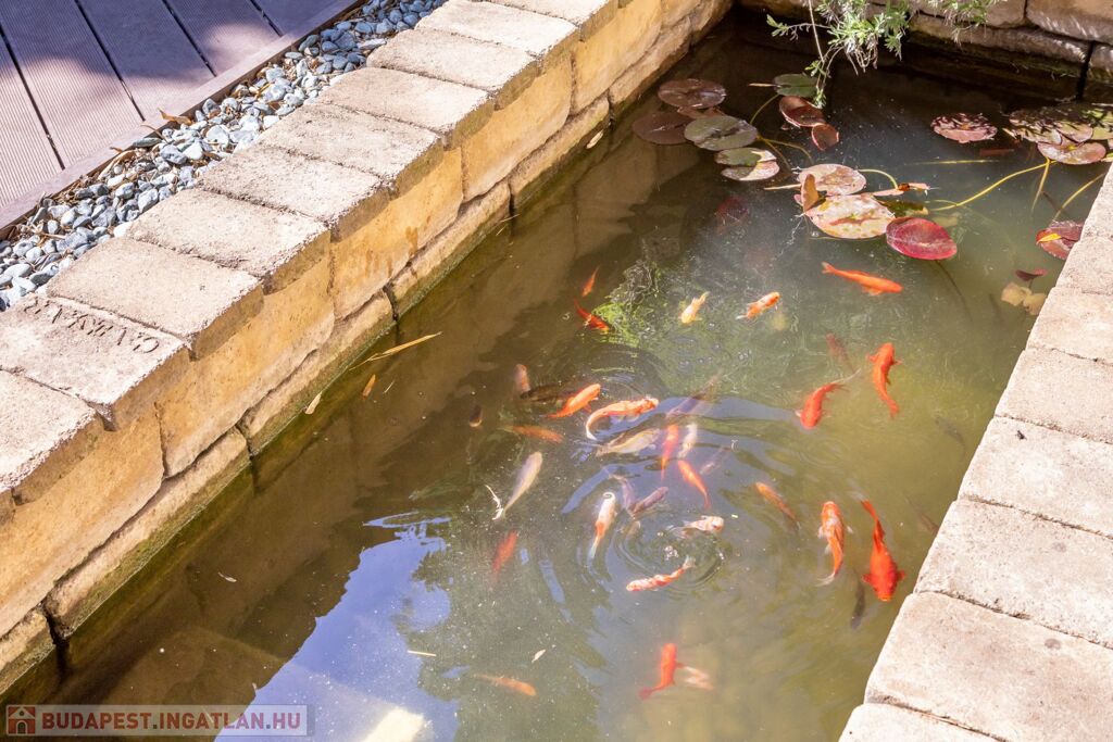 A fedett terasz és a jakuzzi mellet a kertben egy automata vízforgatóval telepített kis tó került kialakításra.