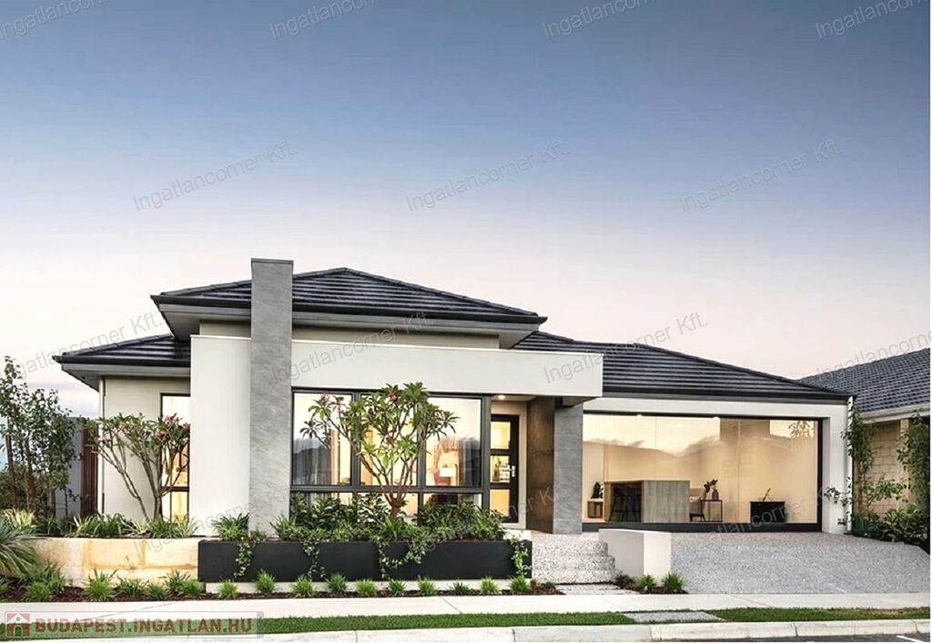 A ház LUXUS kivitelezésű, 70 m2-es TERASSZAL, NAGY MÉRETŰ NYÍLÁSZÁRÓKKAL, DUPLA GARÁZZSAL ELLÁTOTT.