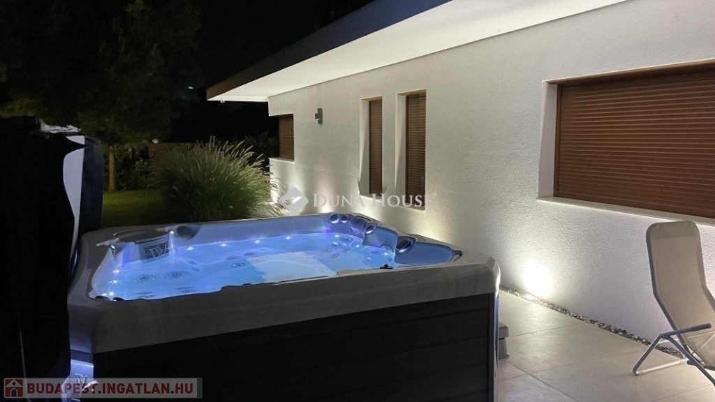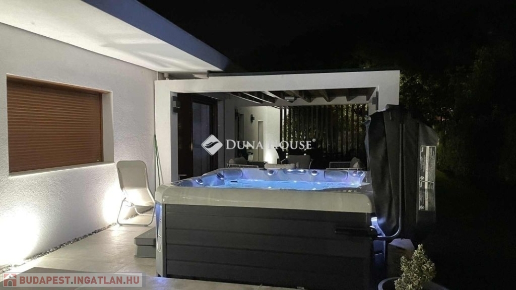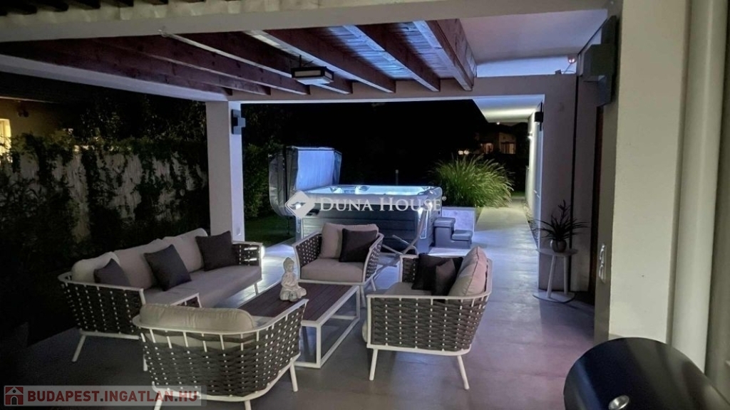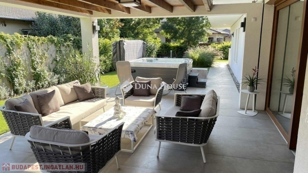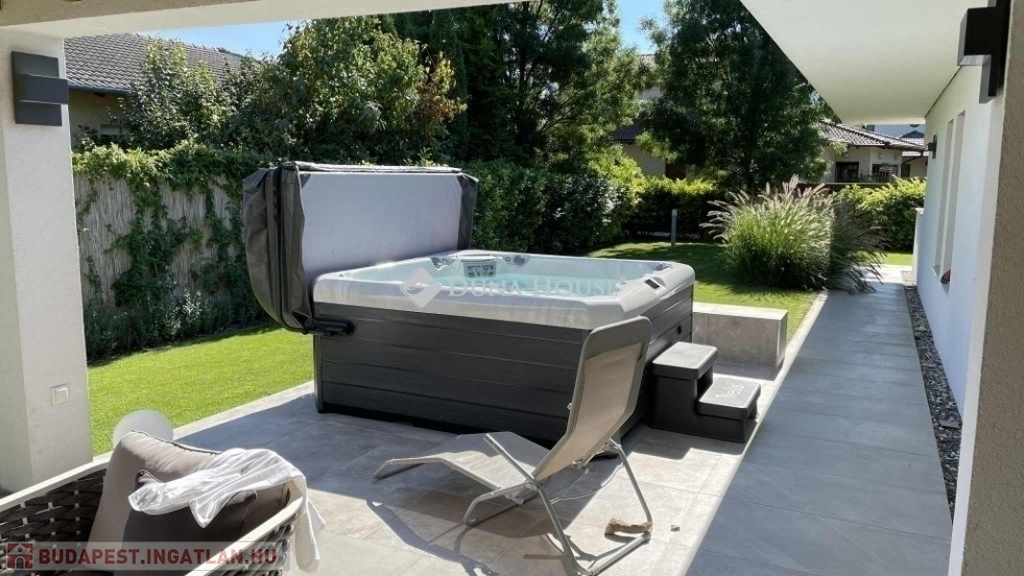 Az ingatlan egyik különleges eleme a 20 négyzetméteres fedett terasz, mely luxus kerti bútorokkal és egy 6 személyes, fűthető jakuzzival várja a pihenni vágyókat.
