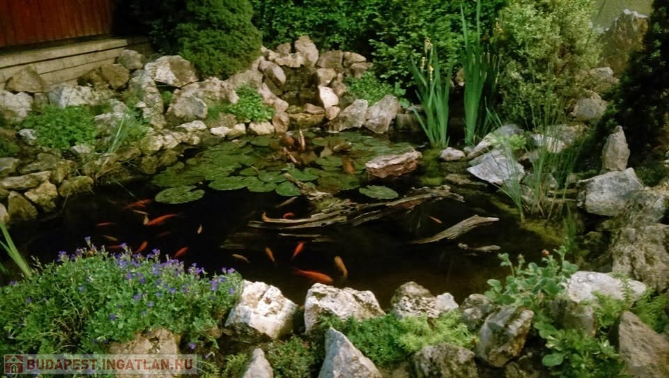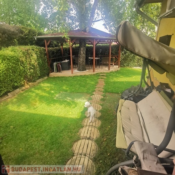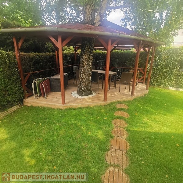 A kerítés mellett körben magas sövény védi a privát szférát, a kert barátságos hangulatáról hátsó terasz, szélvédett bográcsozó és szalonnasütő sarok, tágas, hangulatos szaletli, gondozott fű és egy vadregényes kerti tó gondoskodik. A zöld terület vízellátását fúrt kútról működő távolról is irányítható 4 körös automata öntőrendszer biztosítja az öntözési időszakban.