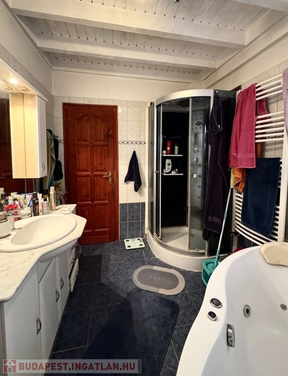 - tágas fürdőszoba zuhanyzóval, fürdőkáddal, mosdófallal, wc-vel,