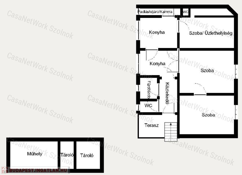 - az egyik szoba üzlethelyiséggé lett alakítva, külön mosdóval és külön villanyórával rendelkezik, víz és gázórákból almérők vannak felszerelve,
