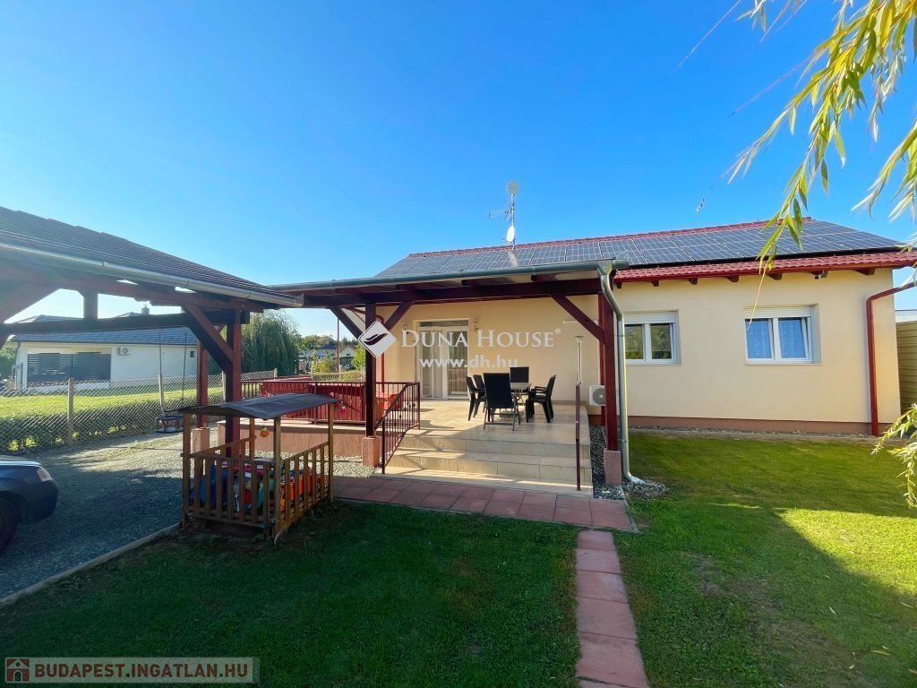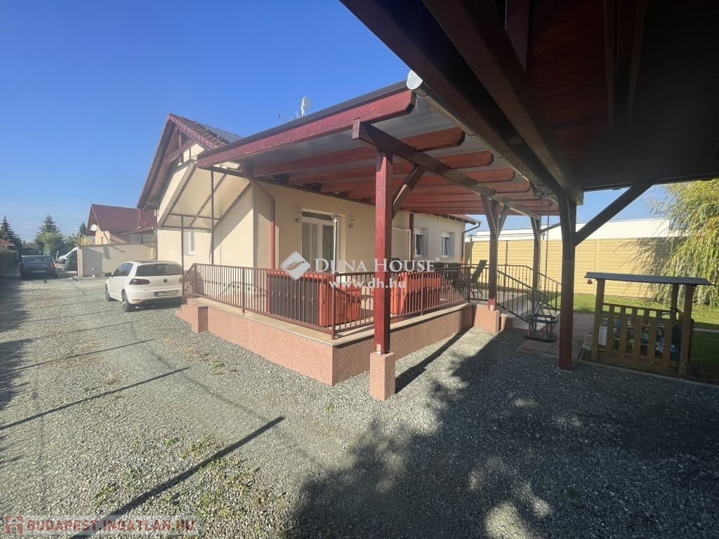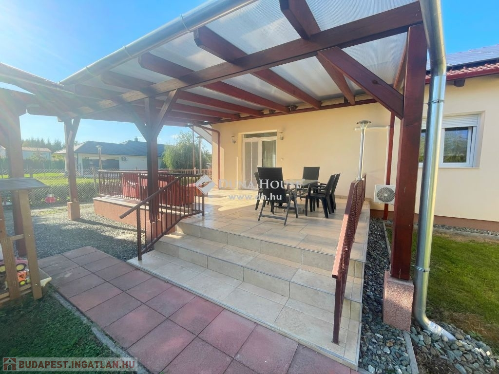 Az ingatlan egy csendes, magánútról megközelíthető belső telken bújik meg, 2017-ben épült. A ház külső klasszikus megjelenése és kimagasló műszaki tartalma, modern letisztult belsővel van ötvözve. Az épület ikerházas kialakítású, egyszintes , a szomszédtól jól elszeparált, teljesen privát életteret biztosít.. Egy fedett terasz felőli előtér vezet az amerikai konyhás nappaliba, melyhez 26 m2 fedett terasz csatlakozik a kert felé fordulva, déli tájolással.