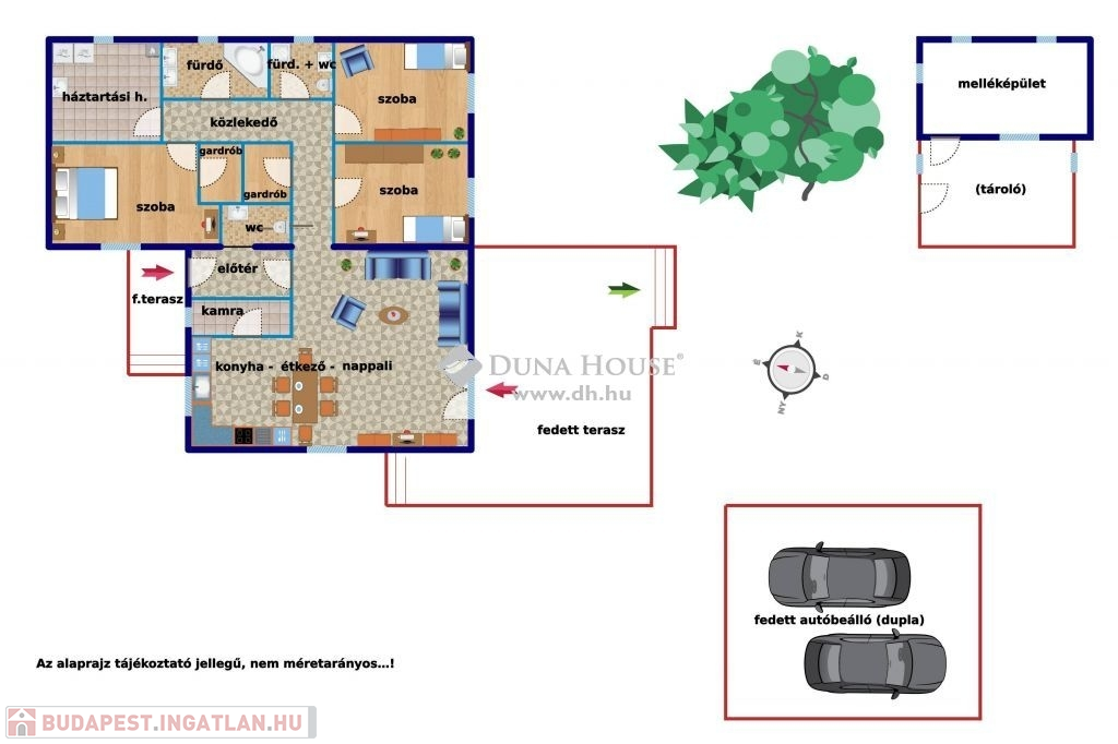 Az épület mellett két autónak fedett beálló van kialakítva..A telek hátsó felén egy melléképület is helyet kapott, mely, tárolásra vagy műhelynek, hobbihelyiségnek is alkalmas. A ház mögötti telekrész parkosított, füvesített...