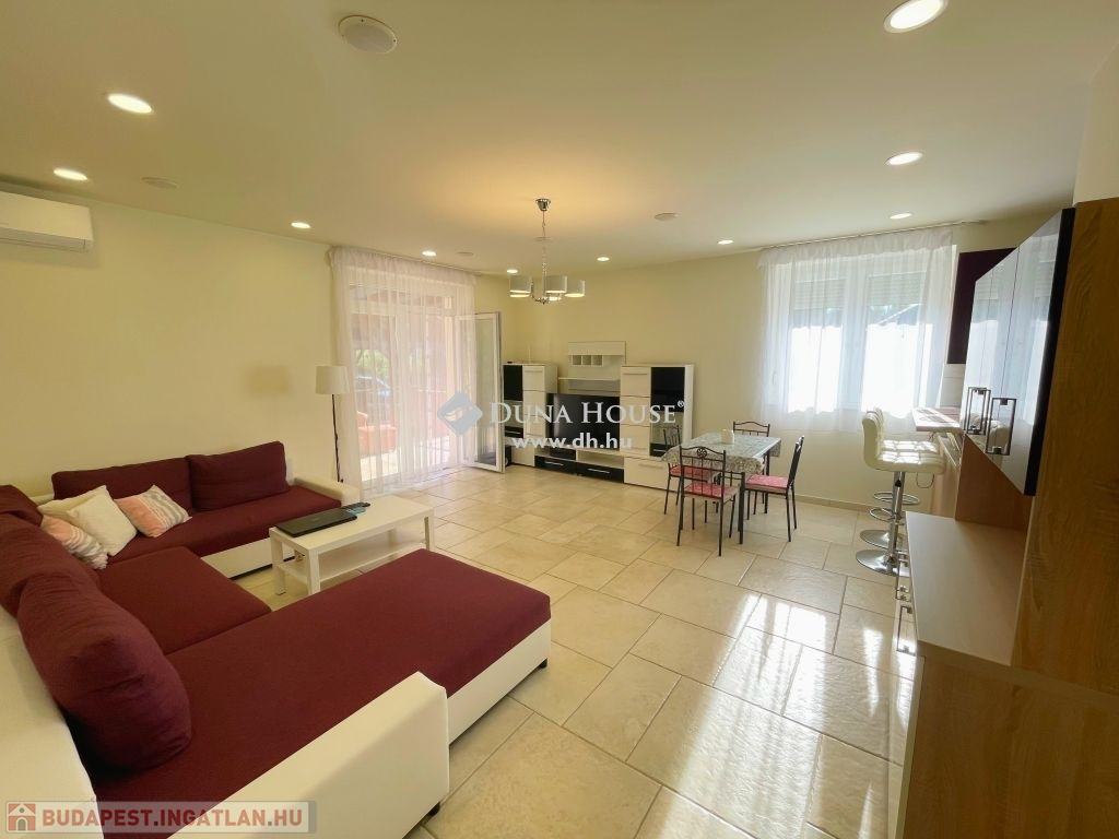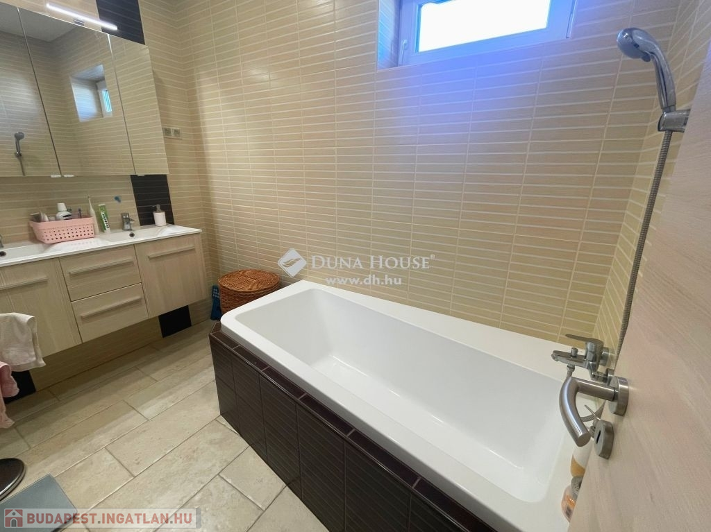 Az ingatlan egy csendes, magánútról megközelíthető belső telken bújik meg, 2017-ben épült. A ház külső klasszikus megjelenése és kimagasló műszaki tartalma, modern letisztult belsővel van ötvözve. Az épület ikerházas kialakítású, egyszintes , a szomszédtól jól elszeparált, teljesen privát életteret biztosít.. Egy fedett terasz felőli előtér vezet az amerikai konyhás nappaliba, melyhez 26 m2 fedett terasz csatlakozik a kert felé fordulva, déli tájolással.
