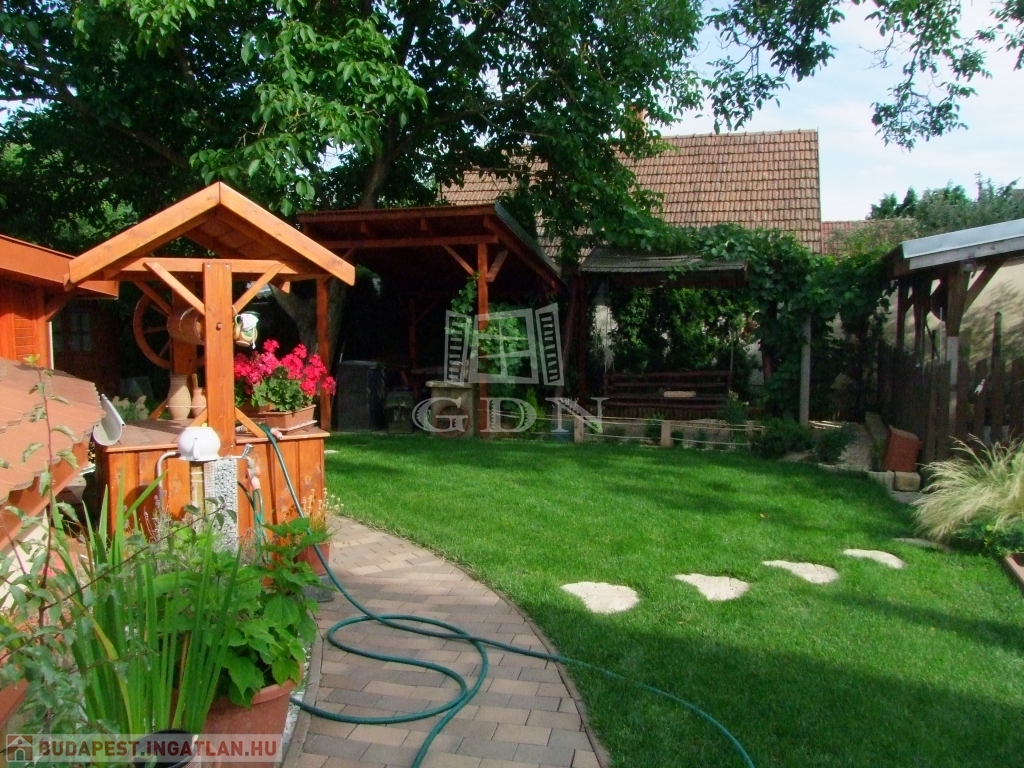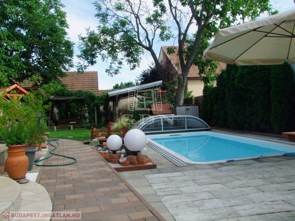 A gondozott parkosított udvaron fedett gépkocsibeálló, 18 m2-es 1.5 m mély fedett medence, kerti hinta, grillező és kerti faház található.
