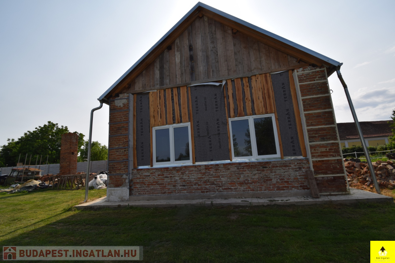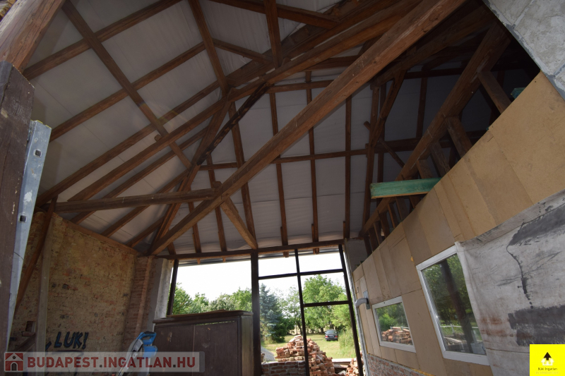 A harmadik és talán a legérdekesebb épület egy 200 m2 alapterületű rendkívül masszív pajta épület, amelynek jelenleg a fele felett van tető. A pillérek állnak és az eredeti elképzelés szerint egy nyitott szín lett volna, de természetesen ez másképp is kivitelezhető. Mivel a térképen az eredeti 200 m2 szerepel ez mindenféle engedély nélkül megoldható. A pajta belmagassága 4 méter !! így akár raktározási célokra is kiválóan alkalmas lehet, de lakóházzá is alakítható. A pajta betongerendával körbe van vasalva és 20 cm vastag Fiber erősítéssel ellátott aljzatbetont kapott így rendkívül erős és masszív lett. Nagy gépek, teherautók, vagy nehéz dolgok tárolására is kiválóan alkalmas lehet. Az épületben egy 45 m2 -es fűthető részben hőszigetelt "pajta műhely" lett kialakítva amely fűthető részben hőszigetelt és könnyűszerkezetes falazattal rendelkezik. A pajta tetőterét pedig szintén többféleképpen hasznosíthatjuk hatalmas méretlének köszönhetően. Lehet tágas lakás, raktár vagy műterem, de hagyhatjuk így nyitottan is az óriási belmagasságának köszönhetően galériásan is.