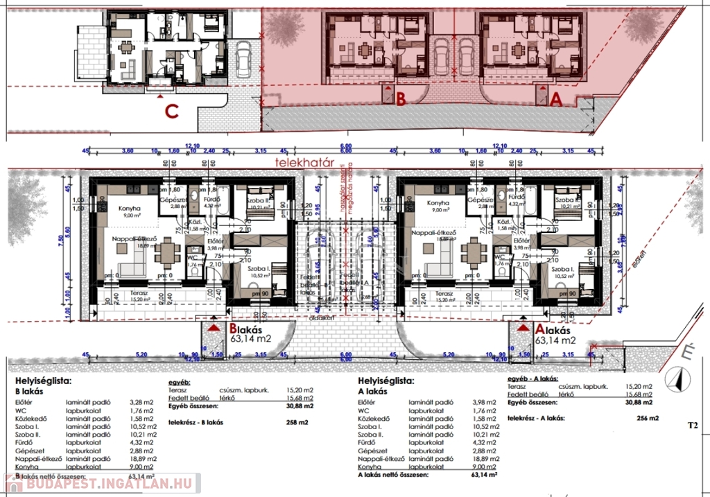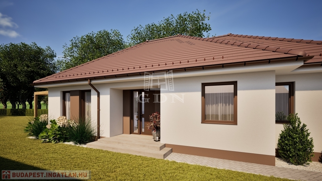 A Wienerberger Porotherm téglából épülő házak magas műszaki tartalommal épülnek. Tetőszerkezete C22 I. osztályú , rovar, gomba és lángmentesítővel kezelt faanyaggal kerül kivitelezésre. Fedése Terran vagy Bramac cseréppel történik, az összes rendszer tartozékkal, előírások szerint helyenként hófogóval. Bádogos szerkezetek, a külső vízelvezetések ereszcsatornái, a lefolyócsövei és az egyéb bádogos szerkezetek 0.6 mm vastag acéllemezből készülnek. Homlokzati falfelületek 15 cm vastag EPS hőszigetelő rendszert, a lábazatok 10 cm vastag XPS lábazati hőszigetelő rendszert kapnak. A padozatokba 10 cm vastag teherbíró EPS hab hőszigetelés kerül. A födém hőszigetelése 25 cm vastag ásványgyapot szigetelőanyaggal történik. Külső nyílászárói műanyag, három rétegű üvegezéssel szerelt, fokozottan hang-és hőszigeteltek. Fűtése, a háztartási helyiségben elhelyezett 10Kw teljesítményű Gree Versati 3 hőszivattyúval történik, padlófűtéses hőleadással szabályozható termosztáttal. A hőszivattyú biztosítja a melegvizet is, egy 200 literes hőtárolós víztartállyal. Nappaliában 3.5 Kw teljesítményű hűtő-fűtő klíma kerül.Az ingatlanban riasztó, kaputelefon, előkészítés történik. Beltéri ajtók, hideg-meleg burkolatok, szaniterek, csaptelepek választhatók.. Ha bővebb tájékoztatást szeretne, kérem keressen. Vegye igénybe irodánk szolgáltatásait. Hitelügyintézésben is segítünk.