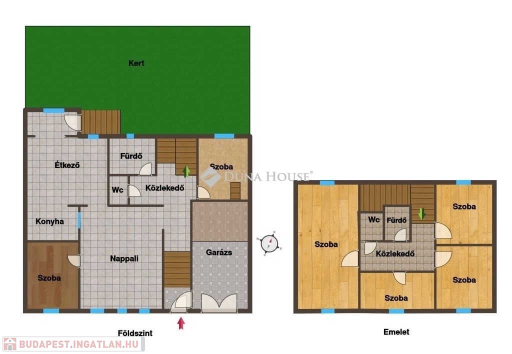 Az emeleten a nappalin kívül 2 egész, egy félszoba, egy fürdő és egy wc lett kialakítva, így akár generációk összeköltözésére is ideáli az épület.