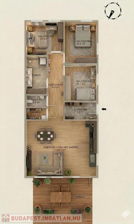 • TÁGAS ÉLETTEREK: Óriási, 34 NM-ES AMERIKAI KONYHÁS NAPPALI a közös családi pillanatokhoz, és 3 KÜLÖNÁLLÓ, LAMINÁLT PARKETTÁS HÁLÓSZOBA a nyugodt pihenéshez.