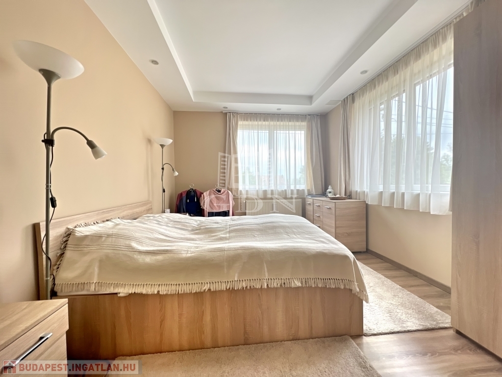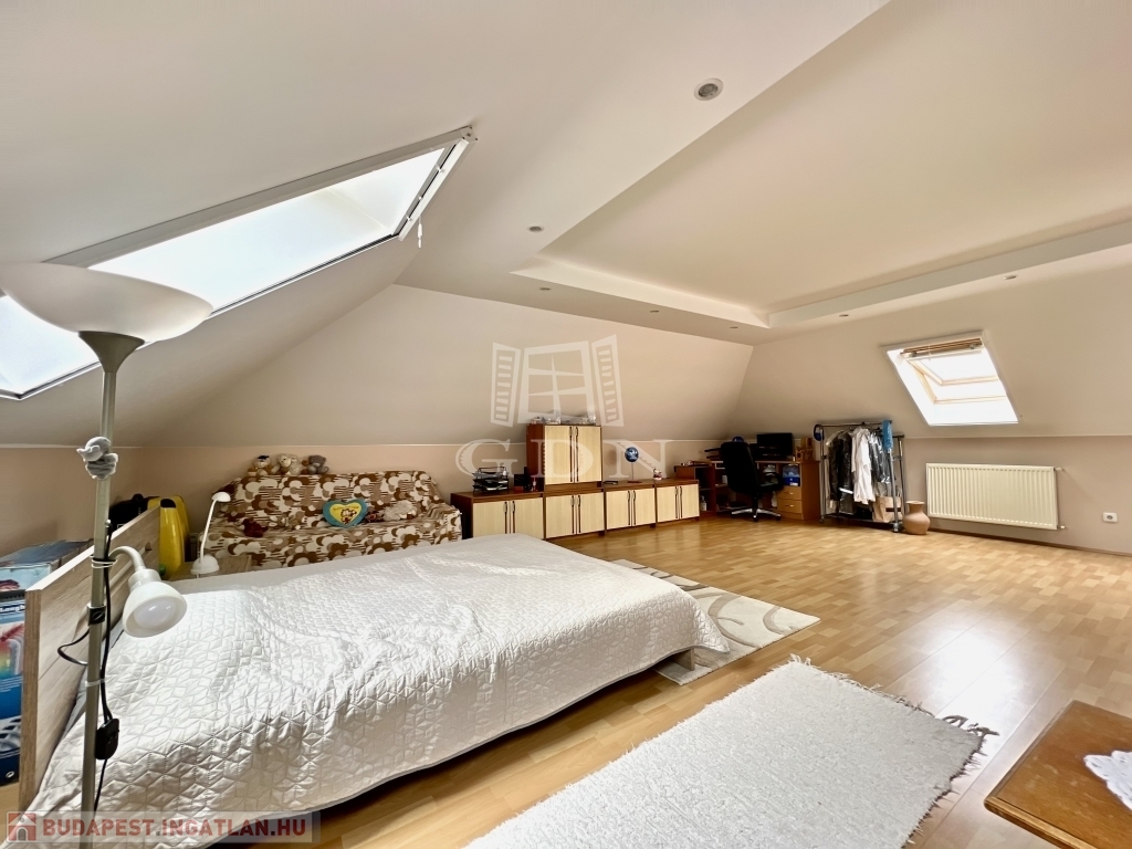 A kert rendezett, barátságos hangulatú, fedett kiülővel és kerti sütőhellyel. Ez az a tér, ahol a nyári esték természetesen telnek, különösebb szervezés nélkül. A házhoz terasz, garázs és több autó számára kialakított udvari parkoló is tartozik.