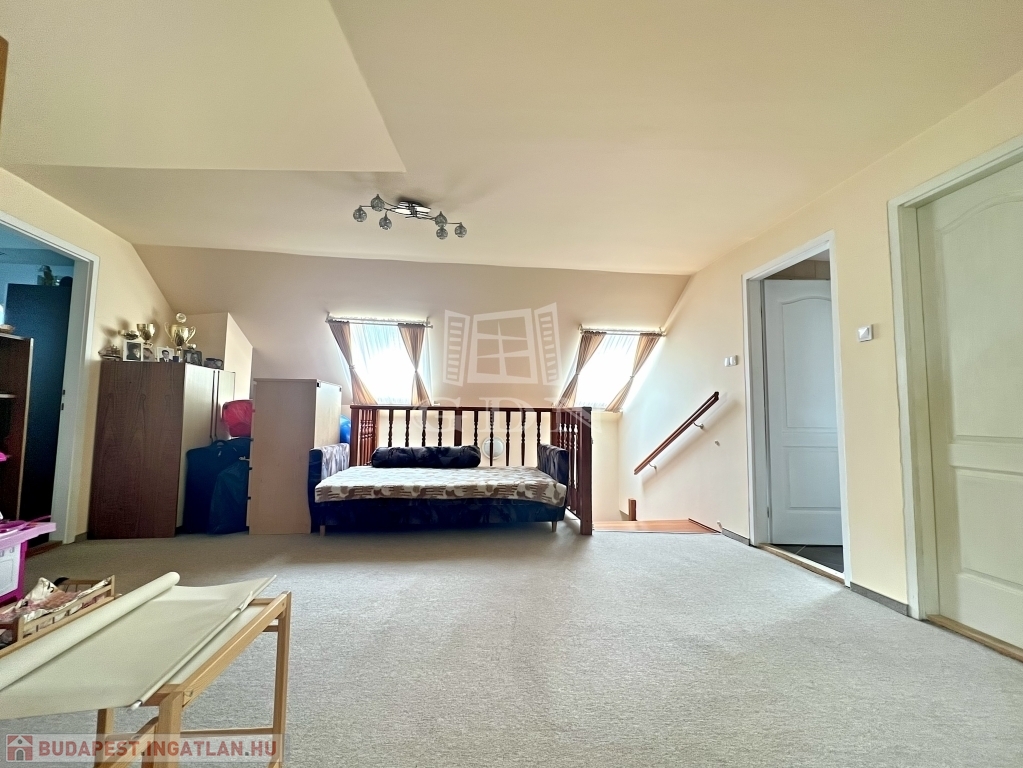 A ház elrendezése kifejezetten jól átgondolt. A földszinten tágas nappali, étkezős konyha, kamra, fürdőszoba és háztartási helyiség kapott helyet, míg az emeleten több hálószoba, külön fürdő és gardrób szolgálja a kényelmes mindennapokat. A belső terek arányosak, világosak, hosszú távon is jól élhetők – akár nagyobb család, akár több generáció számára is.