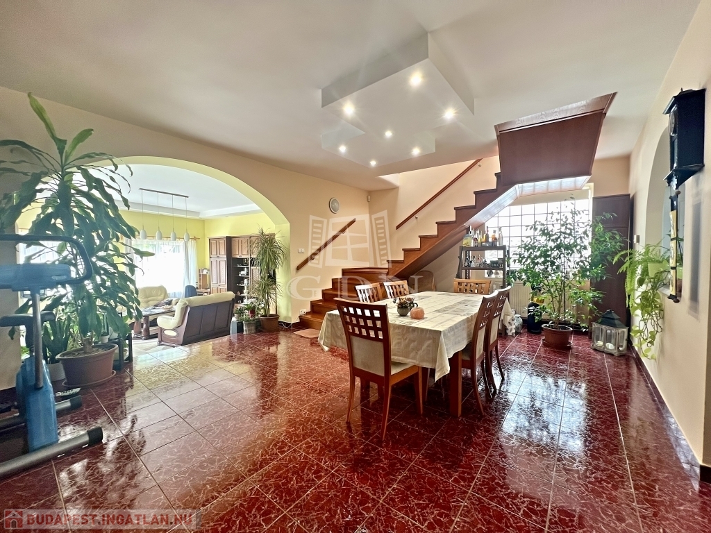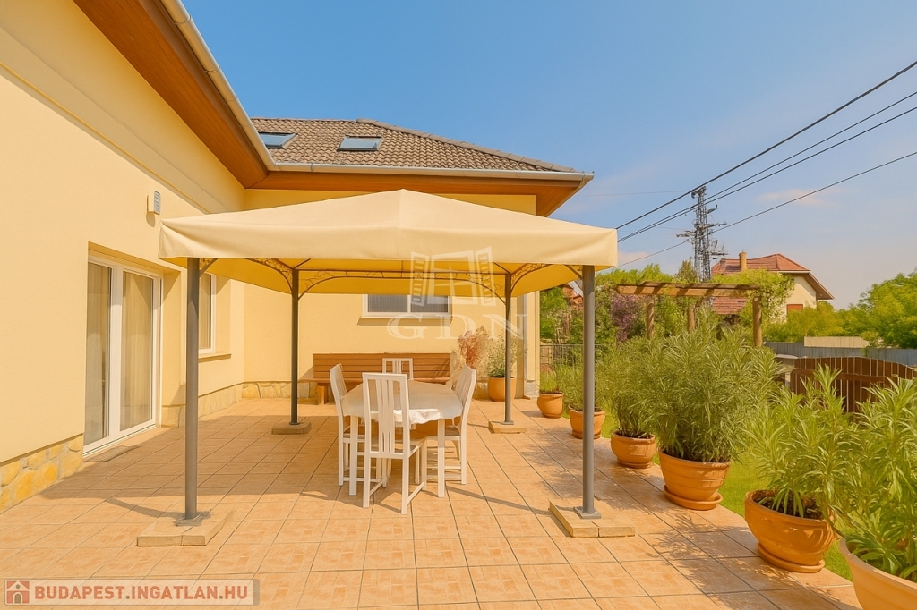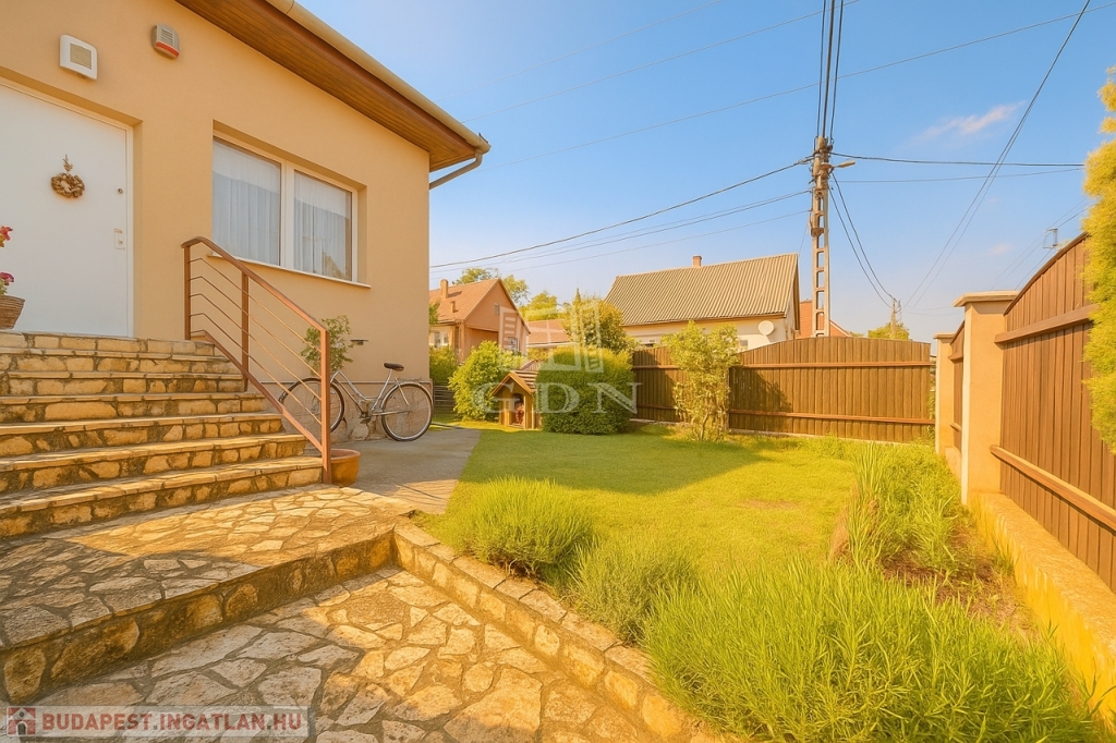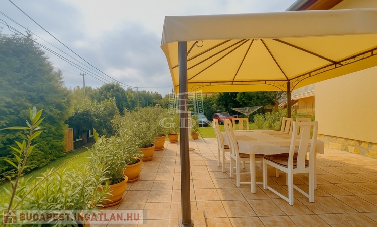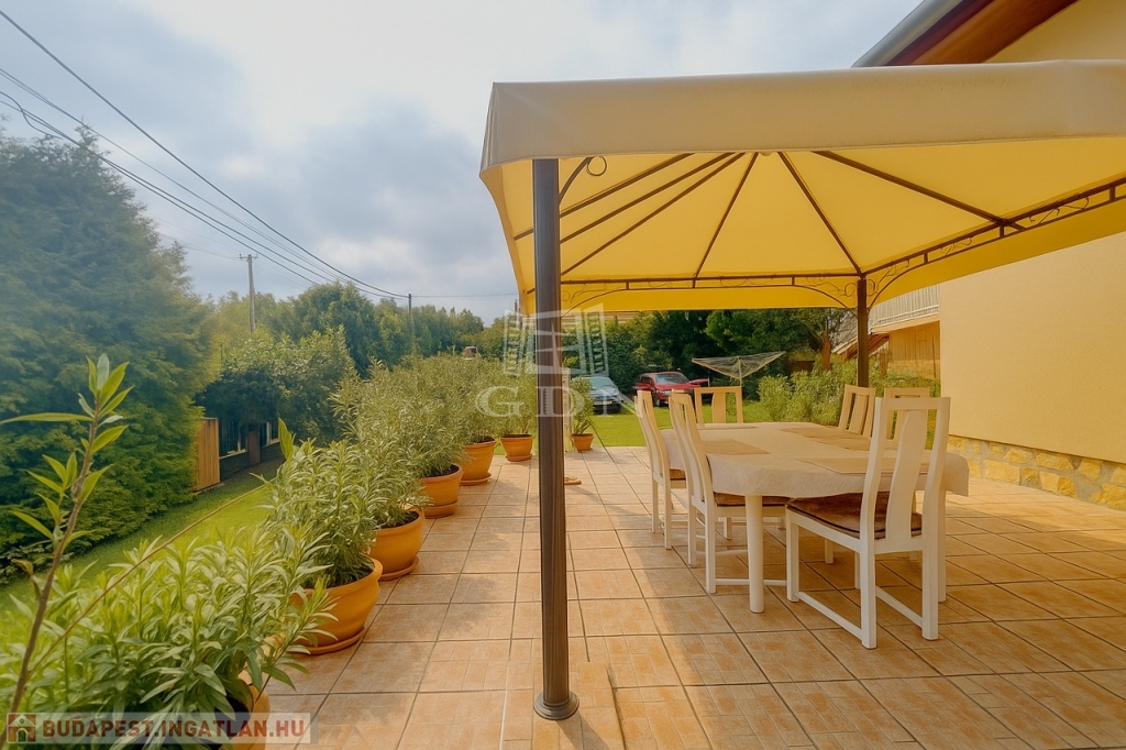 A kert rendezett, barátságos hangulatú, fedett kiülővel és kerti sütőhellyel. Ez az a tér, ahol a nyári esték természetesen telnek, különösebb szervezés nélkül. A házhoz terasz, garázs és több autó számára kialakított udvari parkoló is tartozik.