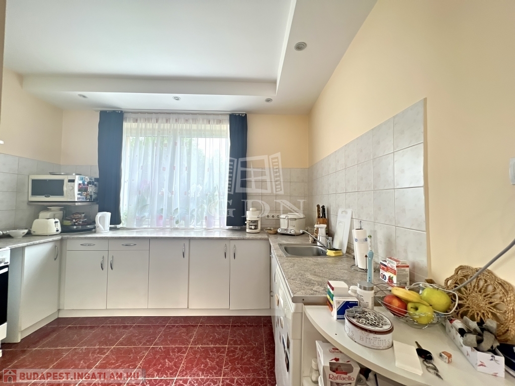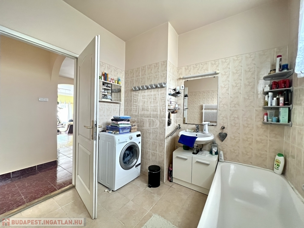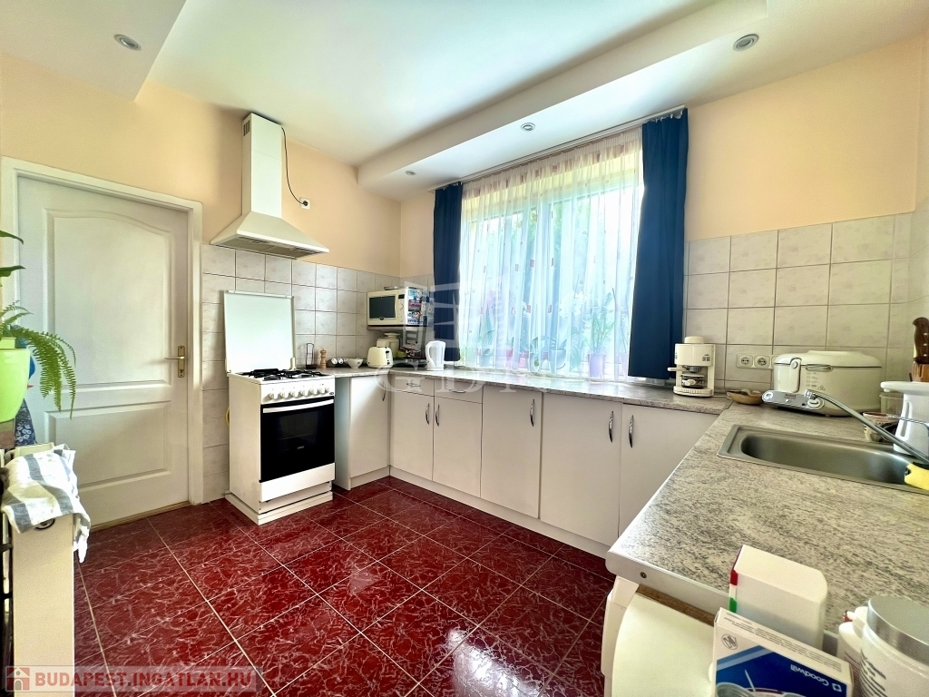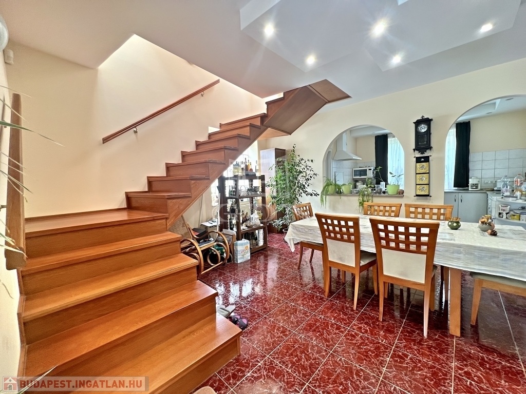 A kert rendezett, barátságos hangulatú, fedett kiülővel és kerti sütőhellyel. Ez az a tér, ahol a nyári esték természetesen telnek, különösebb szervezés nélkül. A házhoz terasz, garázs és több autó számára kialakított udvari parkoló is tartozik.