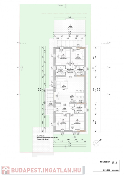 Nettó 126 nm-es lakóterületű, nappali, plusz 4 hálószobás, dupla fürdőszobás, földszintes családi ház 663 nm-es telekkel.