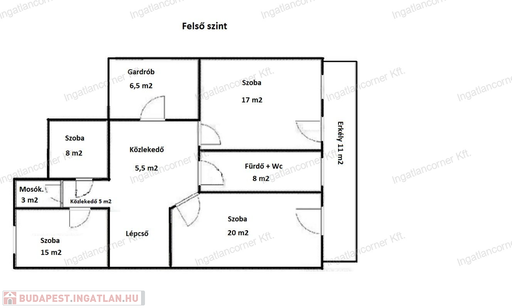 4 hálószoba (20m², 17m², 15m², 8m²),