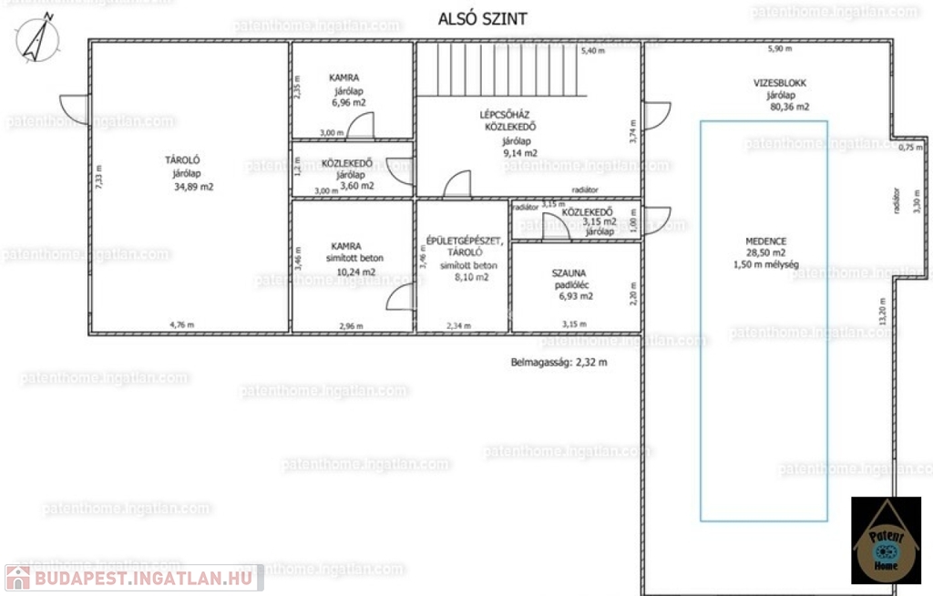 - Az alsó szinten található medence, szauna, épületgépészet, és számos tároló helyiség.