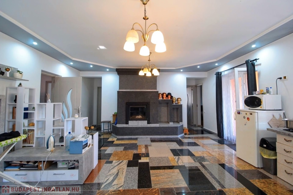 A nappali különleges atmoszféráját nemcsak a tágas tér, hanem az eklektikus hatású gránit- és márványburkolat is meghatározza, amely tökéletes összhangban van a helyiség központi elemével, a nagyméretű kandallóval. A közlekedőkben és a hálószobákban gress márványlapok és laminált padló található, amelyek harmonikus és praktikus burkolatmegoldások.