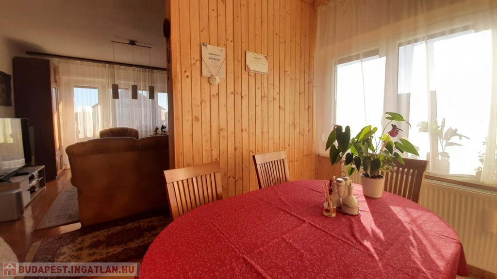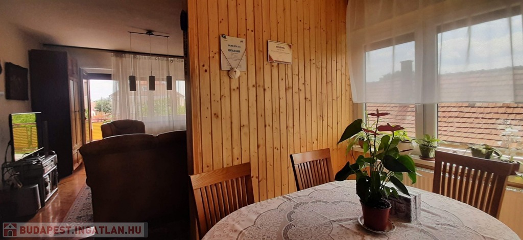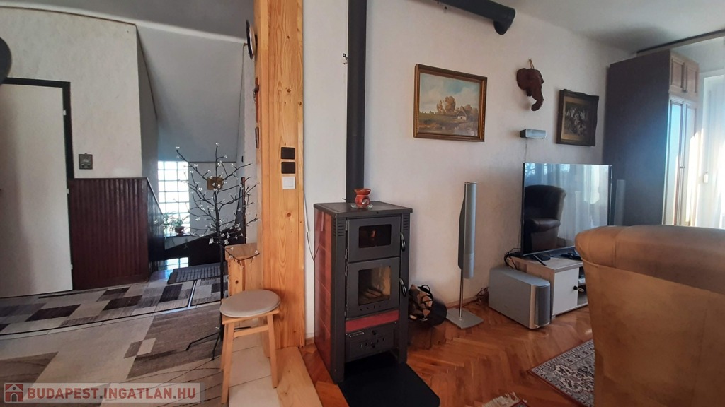 A felső szinten található egy étkezős nappali, mely meglehetősen tágas és világos, itt egy részen már felhelyezésre került az új lambéria. Egy kis pluszt jelent a vadonatúj kandalló, mely nagyon hangulatos a hideg téli estéken.