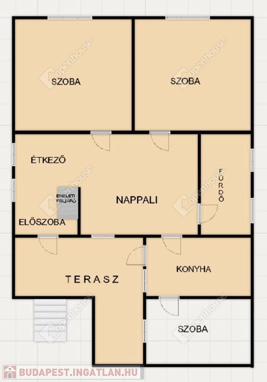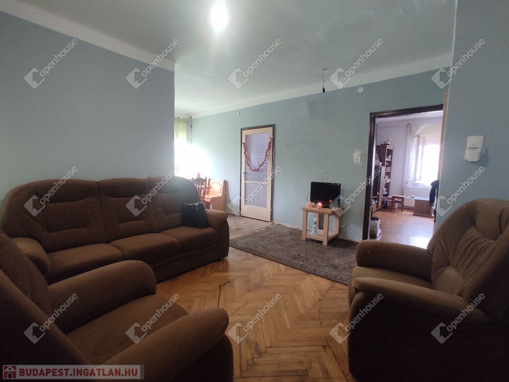 Belső elrendezése jelen kialakításában: előszoba-közlekedő, étkező, nappali, konyha, fürdőszoba, három külön nyíló kényelmes méretű szoba.