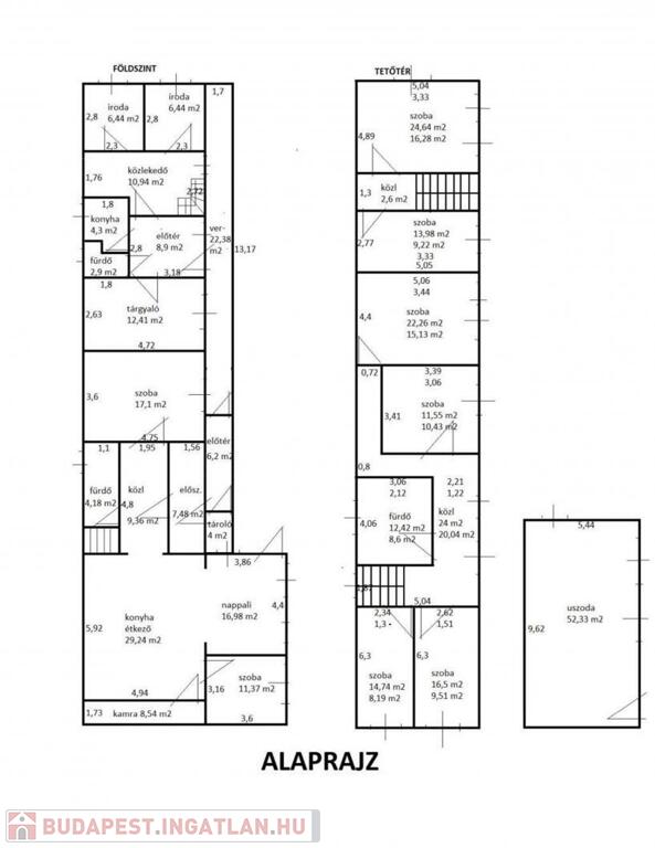 különálló lakrész/iroda :52,25nm + iroda tetőtér része 25,5nm (összesen 77,75nm)