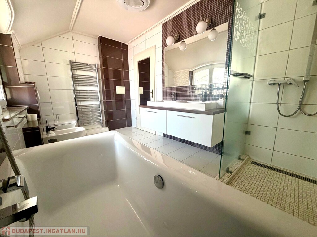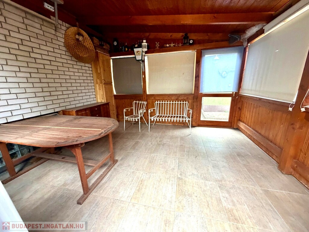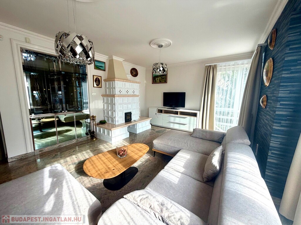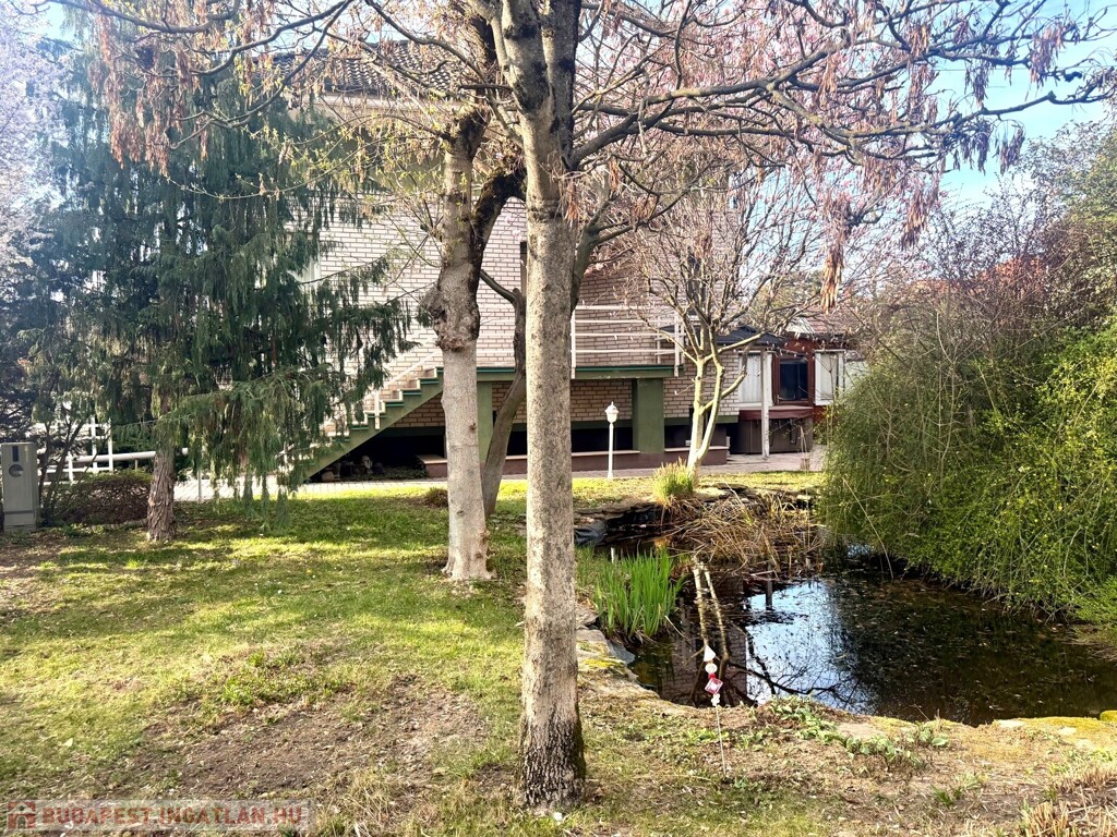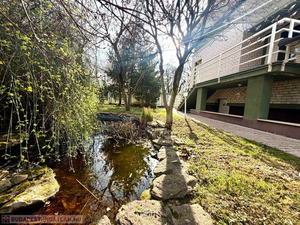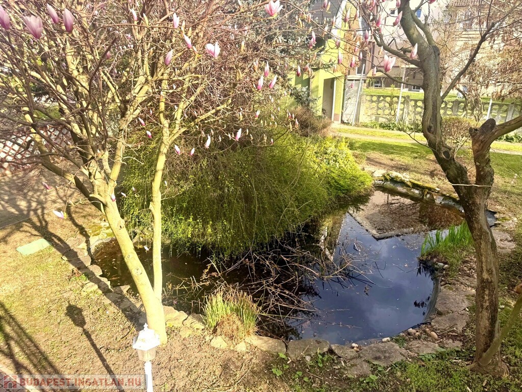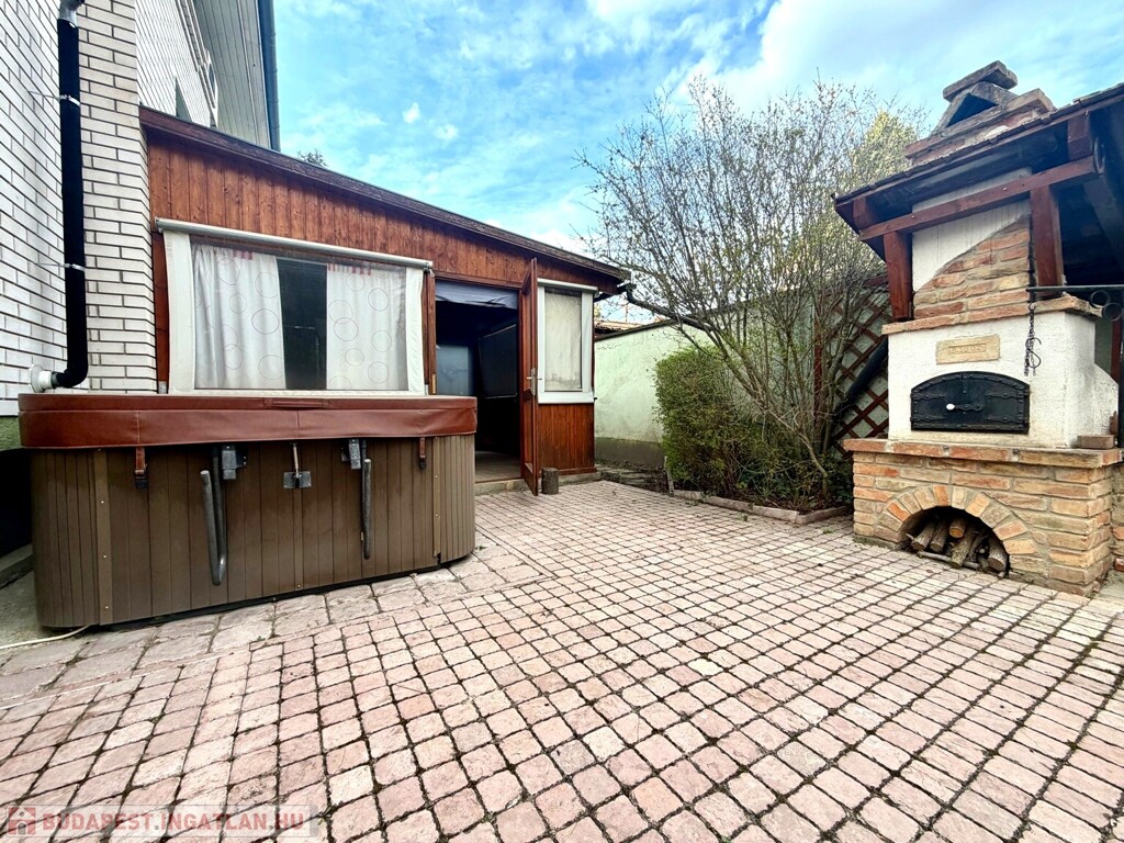 A közel 600 m²-es, két külön helyrajzi számon nyilvántartott telek egy gondosan megtervezett, intim hangulatú kertet foglal magában. A hátsó udvar valódi privát oázis: tardosi kőburkolat, kerti tó csobogóval, kemence, fedett nyári élettér, jakuzzi – mindez úgy kialakítva, hogy a pihenés és a vendéglátás egyaránt magas szinten megvalósítható.