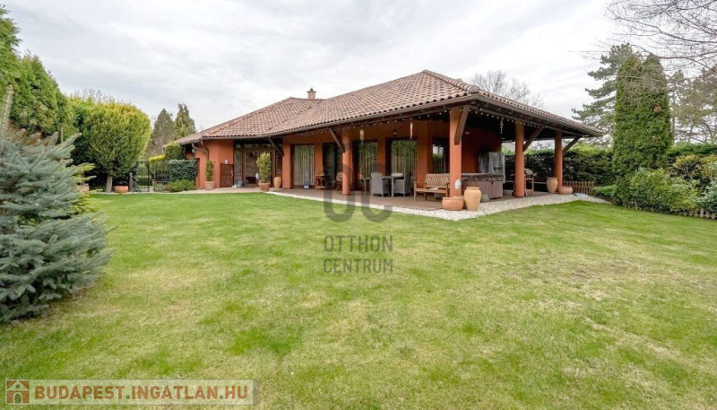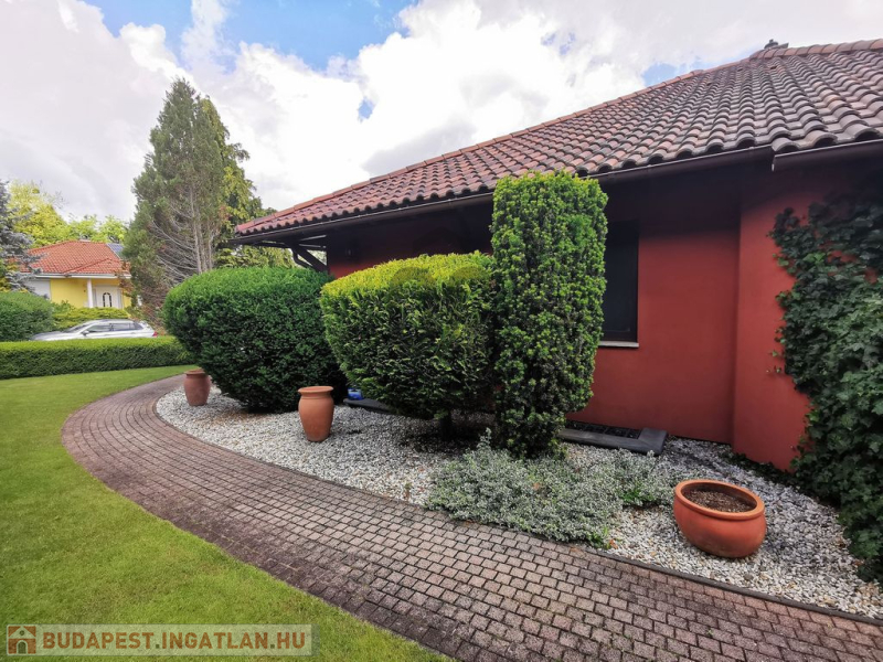 Az 1002 m²-es, teljesen körbekerített, 3 méteres tujasorral körbevett telket gondosan megtervezett, parkosított kert öleli körbe, amely már első pillantásra nyugalmat áraszt – és ez az érzés végigkíséri a ház minden zegét-zugát.