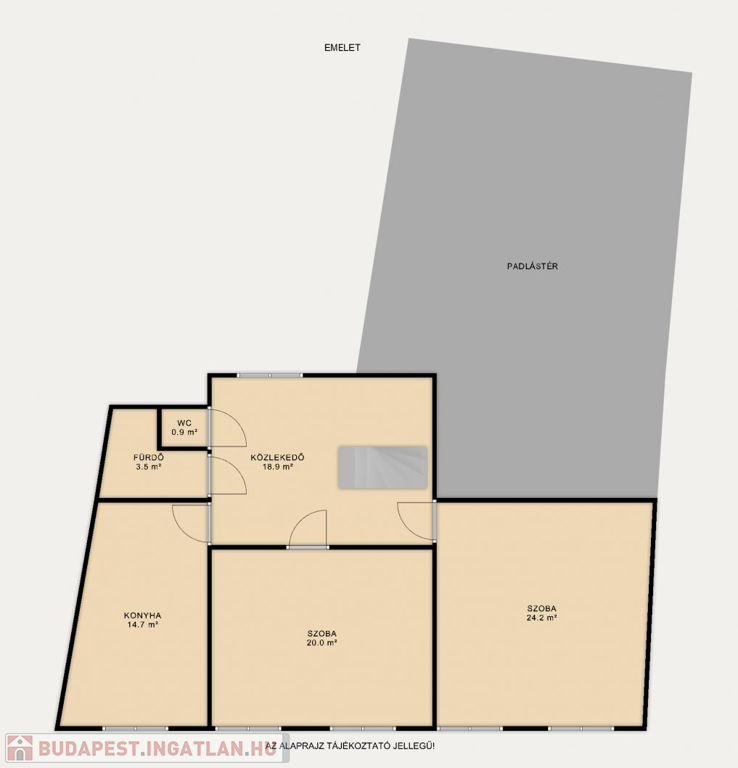 HÁROM, egyenként közel 25 M²-ES, tágas és világos SZOBA biztosítja a kényelmes lakhatást. Ezen a szinten található továbbá egy különálló KONYHA, ÉTKEZŐ, KAMRA egy FÜRDŐSZOBA, valamint egy központi LÉPCSŐFELJÁRÓ, amely a tetőtérbe vezet.