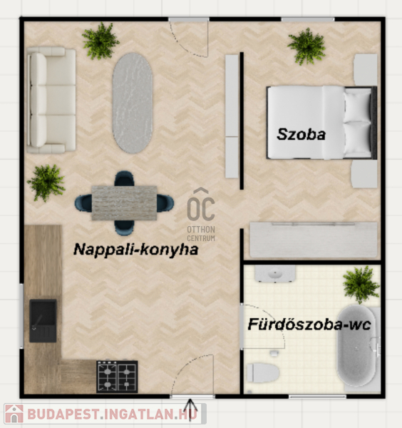 - elosztása: nappali-konyha, fürdőszoba-wc, szoba