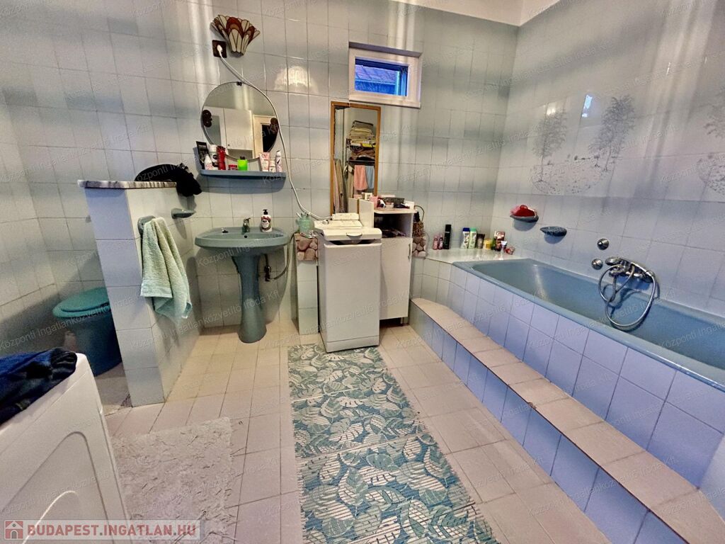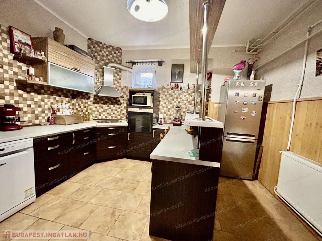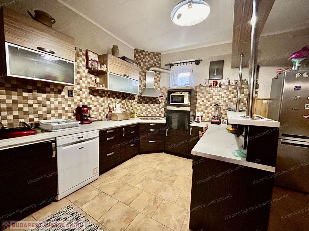 Az alsó szint 75 m2, ebben 3 szoba, egy WC, egy óriási konyha és étkező, nappali kapott helyet. A nyílászárók újak, a falak és a burkolatok jó minőségűek.