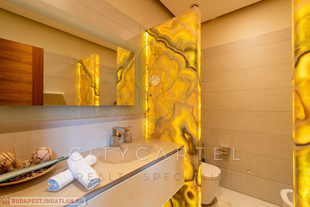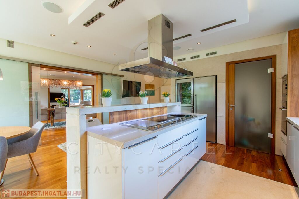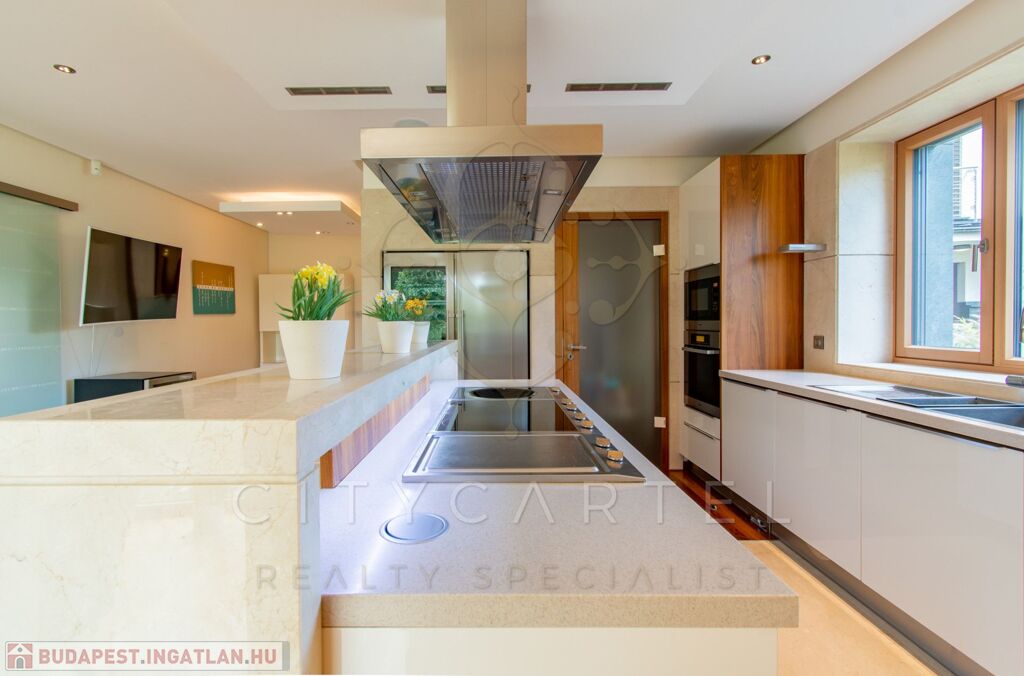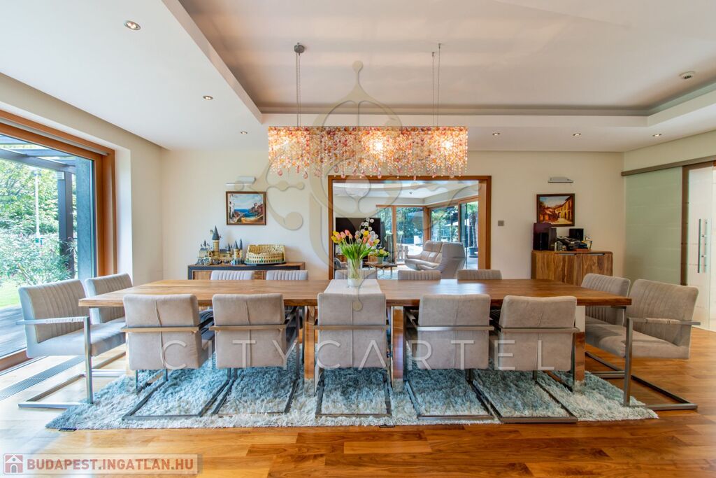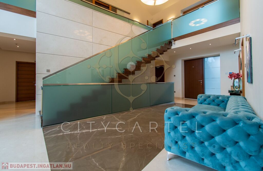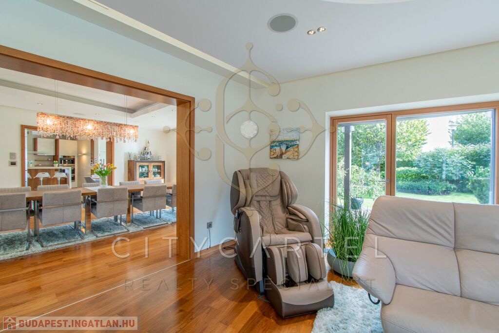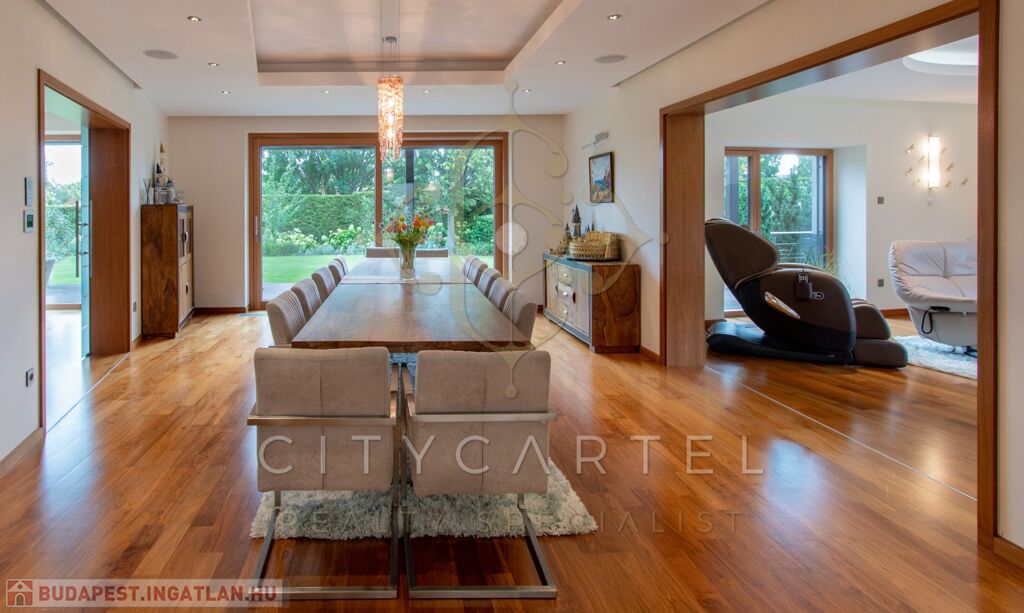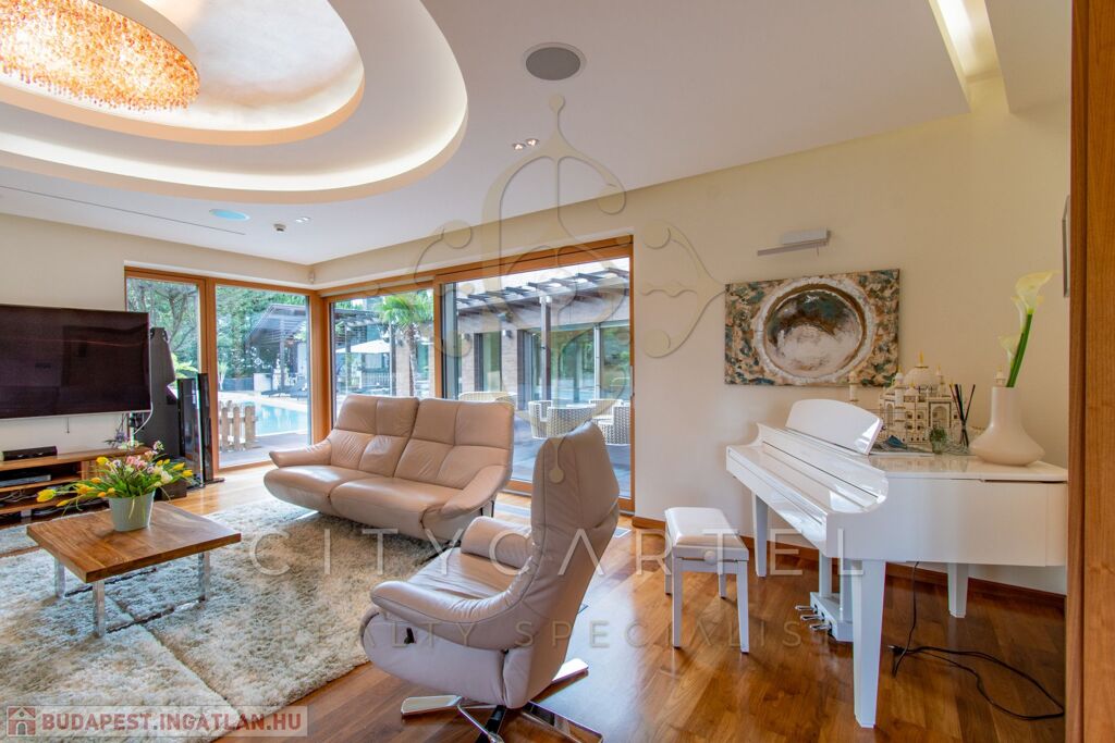 A földszinten található továbbá hálószoba saját fürdőszobával és gardróbbal, dolgozószoba, fürdőszoba onyx kővel, 4 állásos garázs, úszómedence pezsgőfürdővel és minibárral.