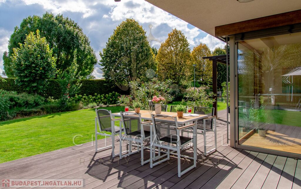 A 3.655 nm-es parkosított telken úszómedence, kerti tó, focipálya, kutyakennel, játszótér, fedett grillező, melléképület, nagyméretű teraszok, konyhakert, rózsakert található.