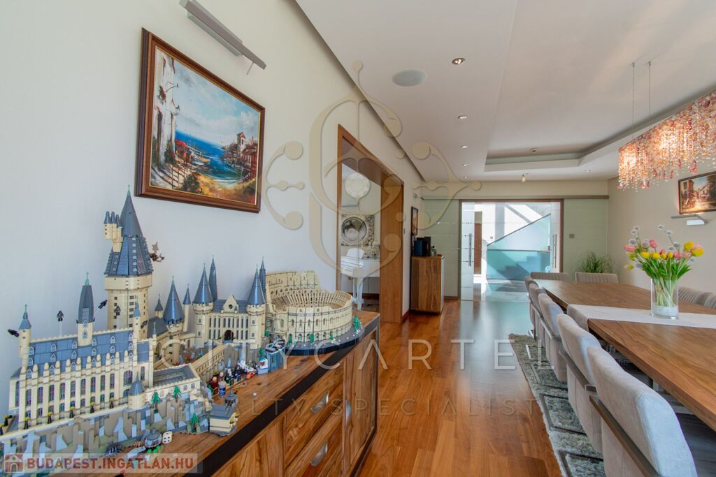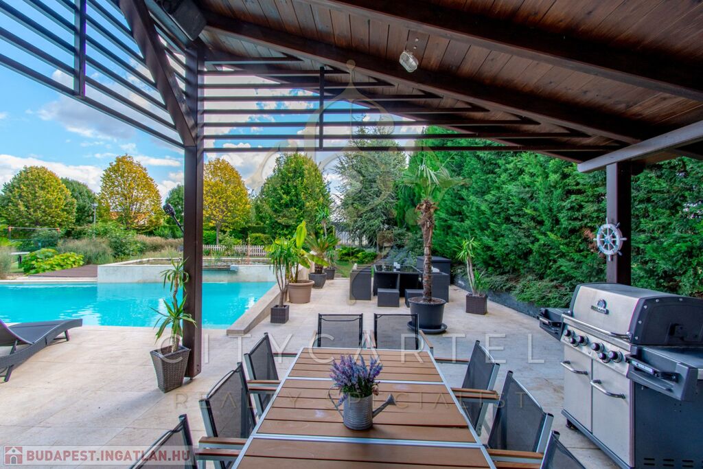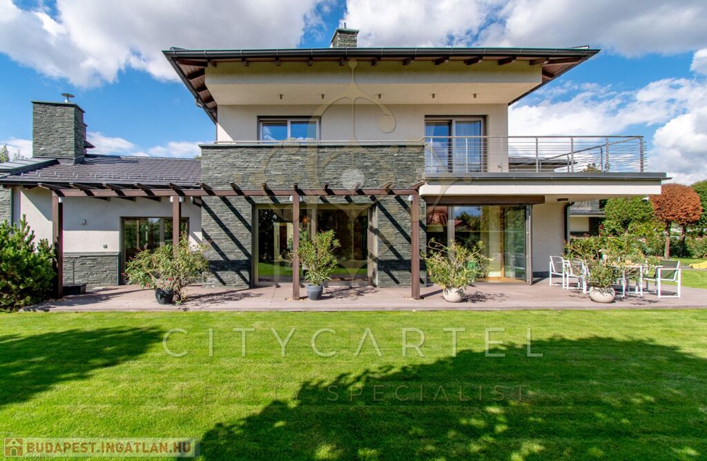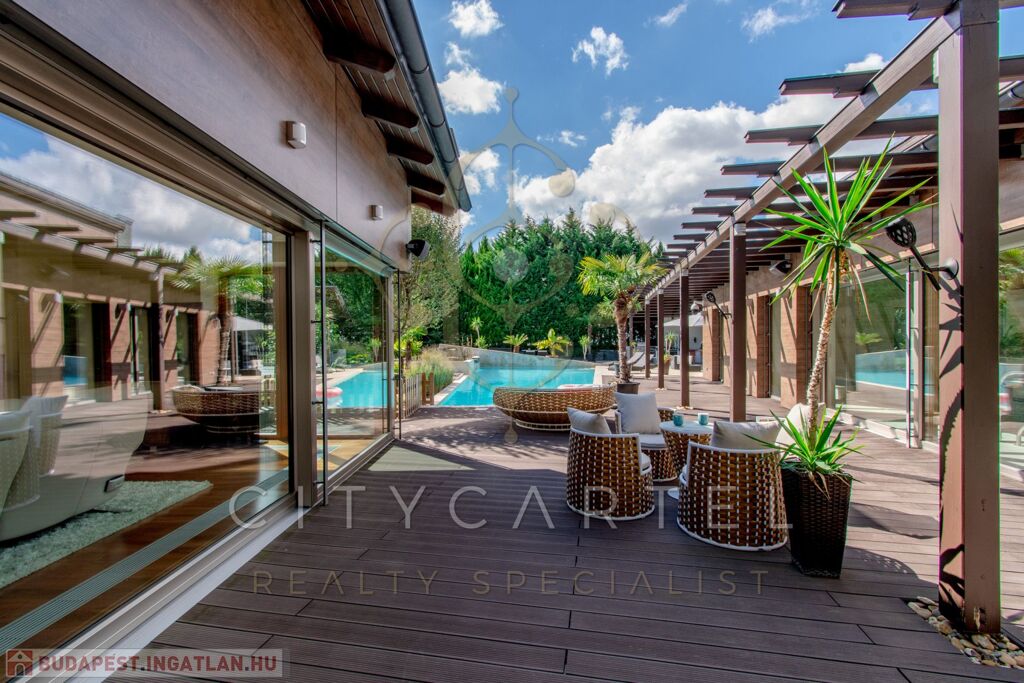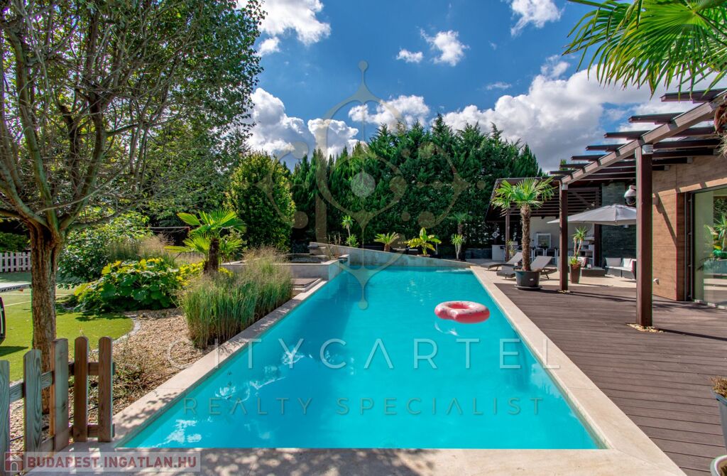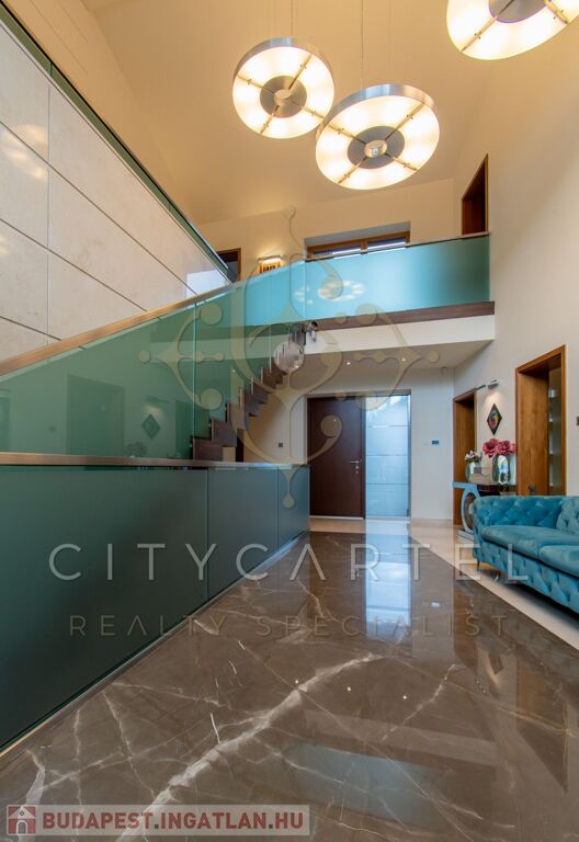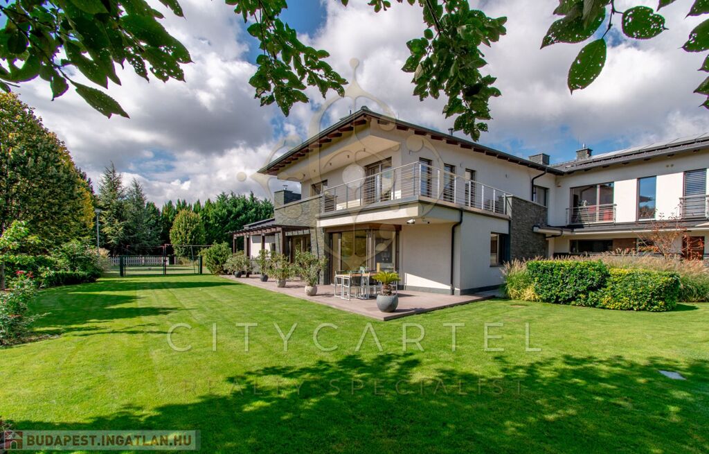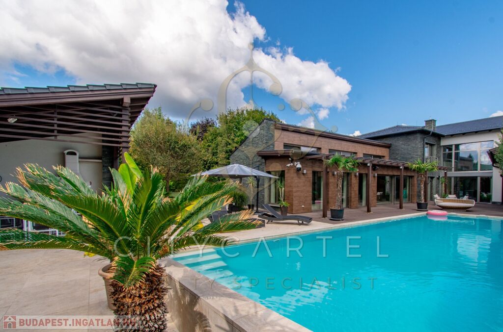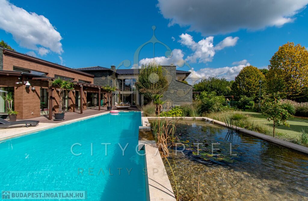 Lépjen be ebbe a káprázatos, mansion jellegű luxusvillába, amely a Budapesttől csupán 15 percre fekvő Telkiben található, egy 3655 négyzetméteres, parkosított telken. Ez az 1060 négyzetméteres, 2012-ben épült, minimalista stílusú, intelligens ház olyan, mint egy állandó nyaralóhely, nem csupán nappalit és 8 hálószobát kínál, hanem számtalan extra szolgáltatást is: két medence (kültéri és beltéri), kerti tó, játszótér, wellness részleg, focipálya, borospince, biliárdszoba, fitneszterem, moziszoba gondoskodnak a kényelemről és szórakozásról.