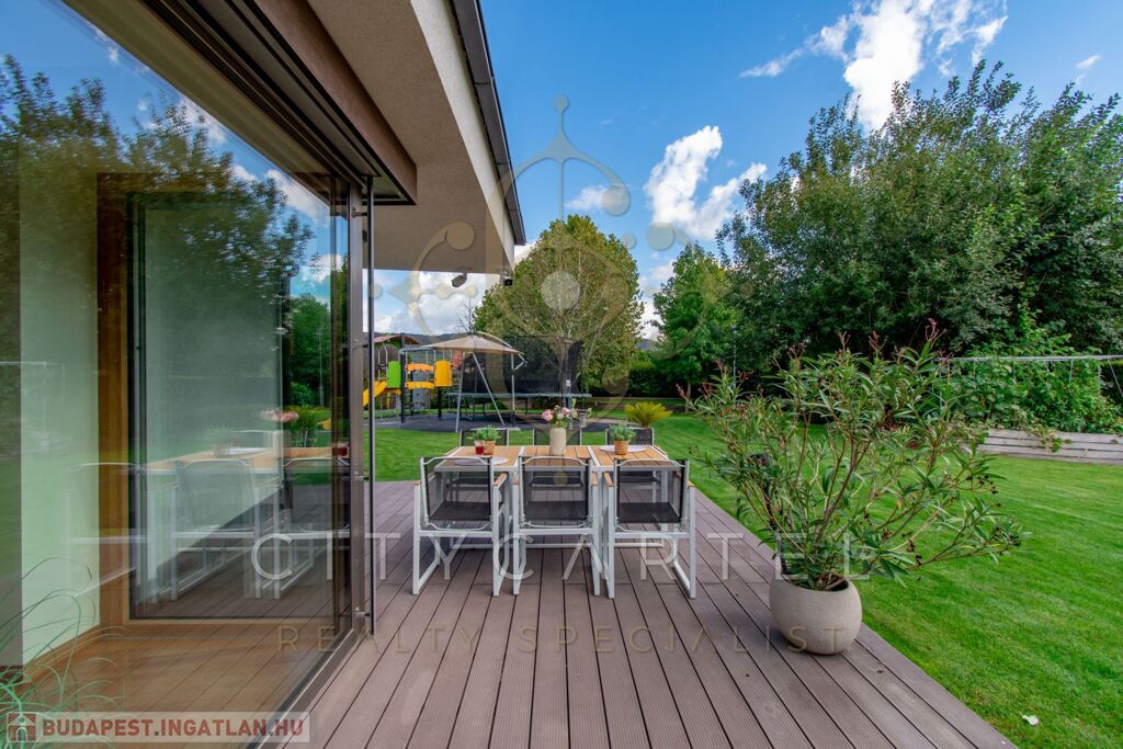 A földszinten a nappali, étkező és a Miele gépekkel felszerelt konyha és a nagyméretű kamra mellett egy játékszoba is helyet kapott, ahol a gyerekeket szemmel tarthatjuk, miközben a felnőttek pihenhetnek a tágas nappaliban vagy élvezhetik a kültéri teraszok nyújtotta kényelmet, amit mindegyik helyiségből el lehet érni.