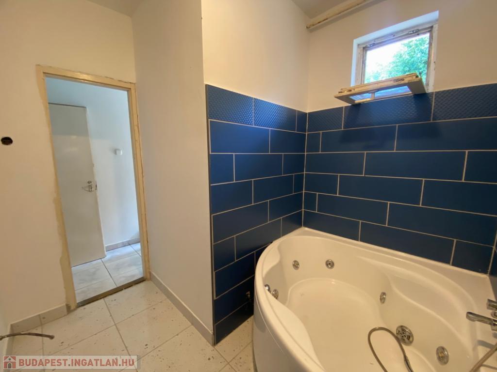 A fürdőszoba sarokkáddal, külön nyíló WC-vel, szellőztethető ablakkal rendelkezik.