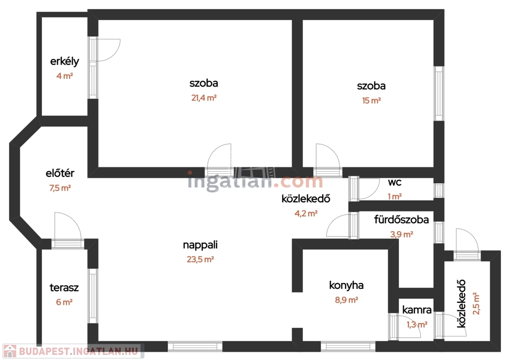 szoba 18,5m2, konyha-étkező-előtér 14,6m2, fürdőszoba 2,65m2, kamra 1,7m2;