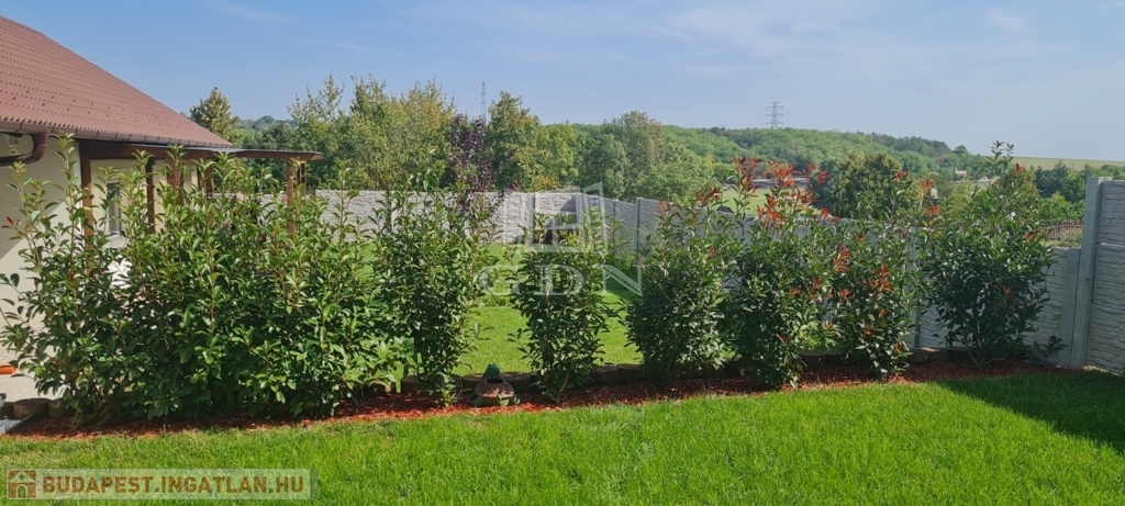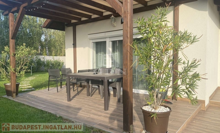 Eladó egy újszerű állapotban lévő, 138 m²-es családi ház, amely jogilag családi ház, de kialakításában inkább egy ikerház jellegű ingatlan – az épületek csak a fedett kocsibeállónál érnek össze.