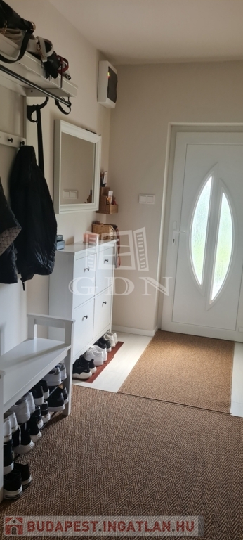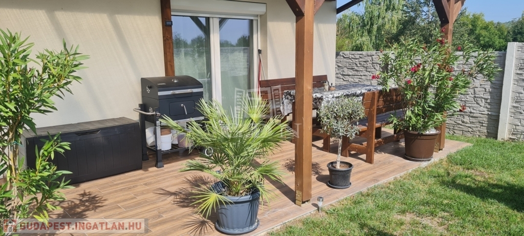 Eladó egy újszerű állapotban lévő, 138 m²-es családi ház, amely jogilag családi ház, de kialakításában inkább egy ikerház jellegű ingatlan – az épületek csak a fedett kocsibeállónál érnek össze.