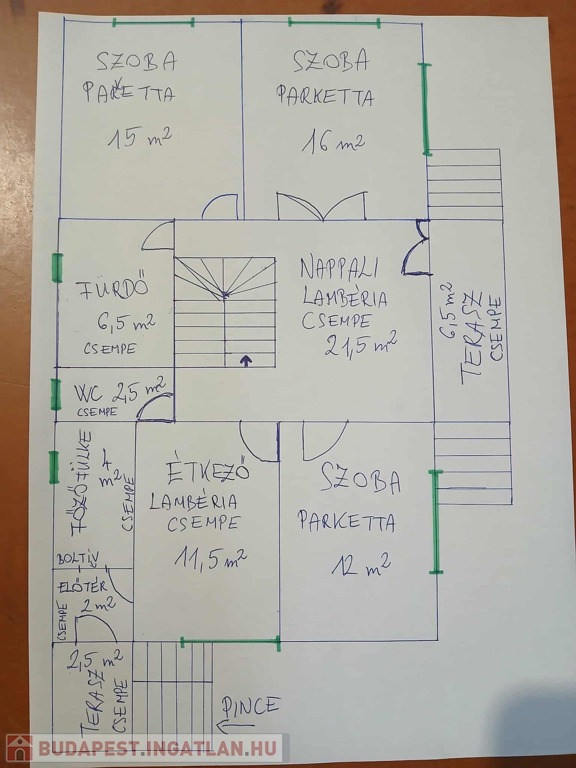 Földszint: (100m2) 3 külön nyíló szoba (parkettás), tágas nappali, konyha + főzőfülke, fürdőszoba (150 literes bojlerrel), külön WC, előtér, pincelejáró. Egyik szobában WiFi-s klíma is található.