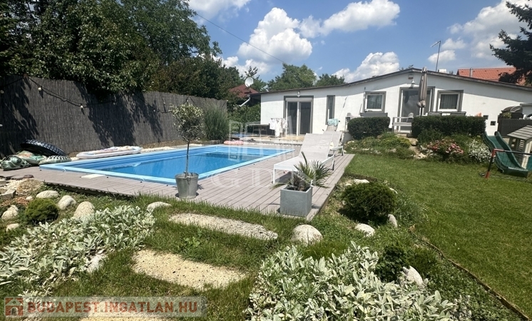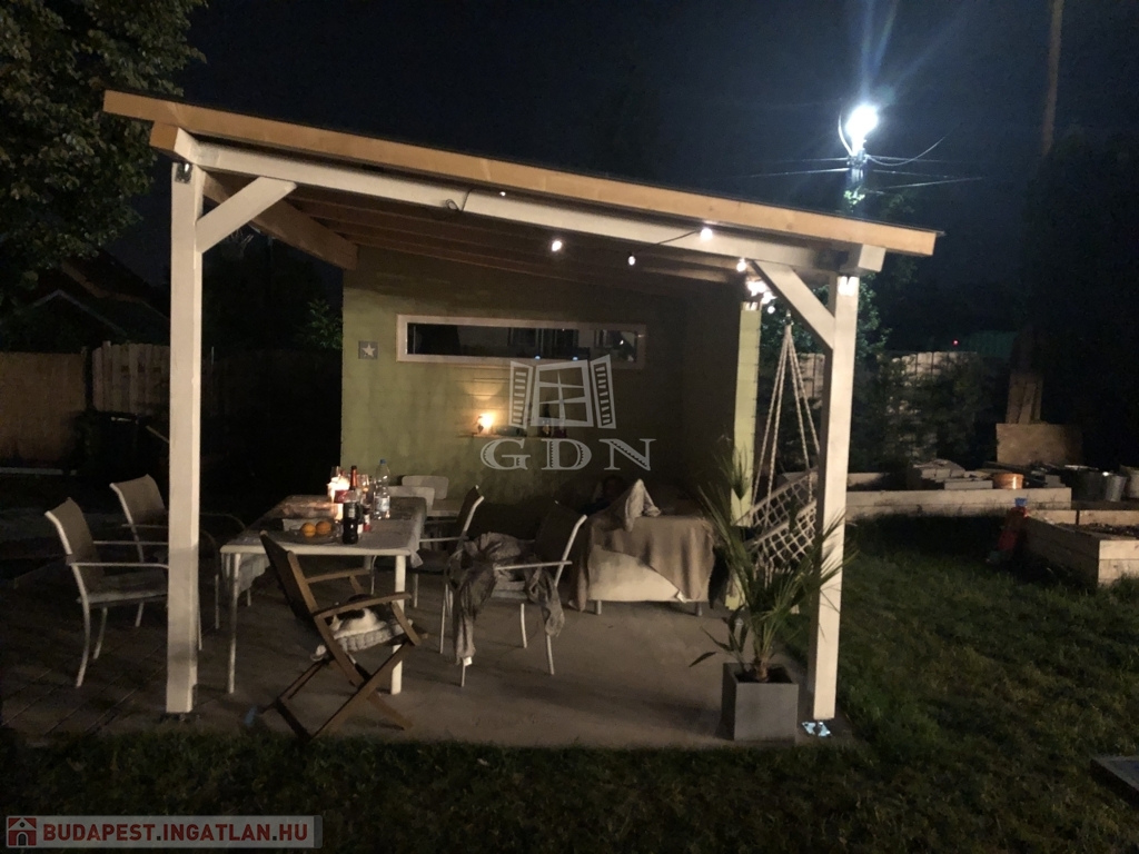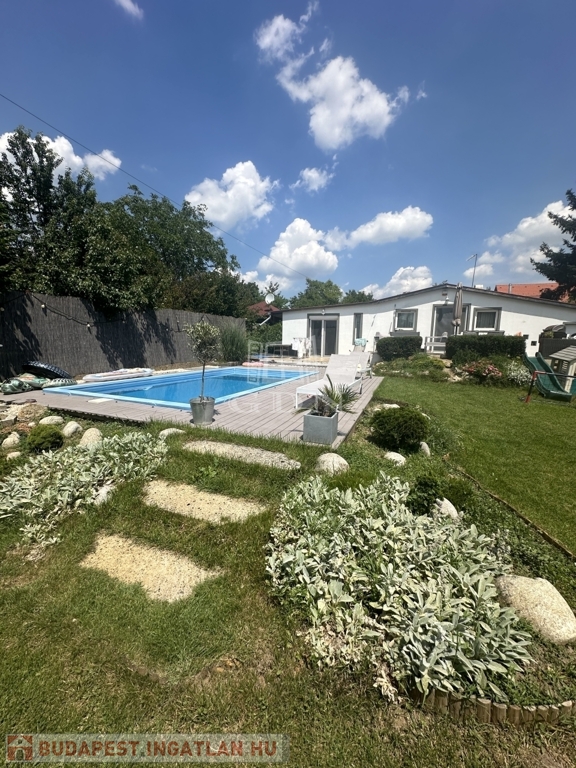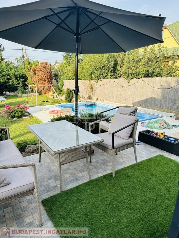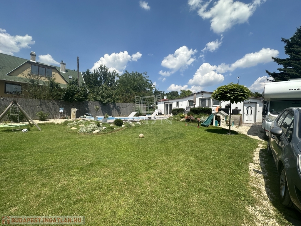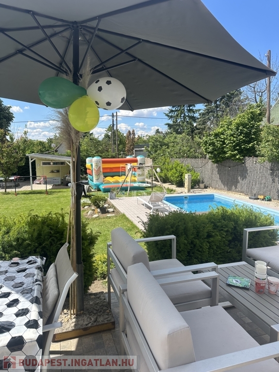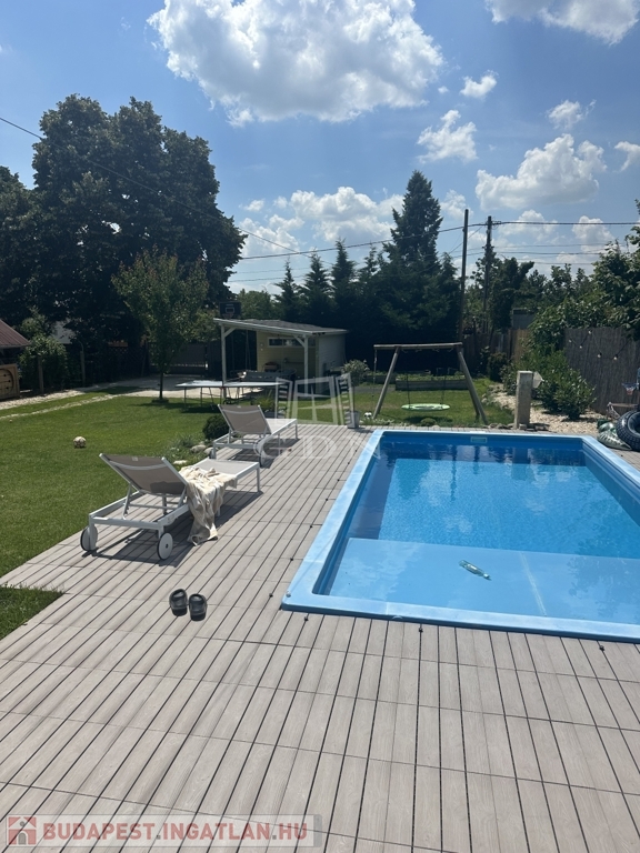 A parkosított kertben egy 6 X 3 méteres vízforgatós medence található. Ezen felűl egy 10 nm - es faház saját terasszal is rendelkezésre áll, amely ideális hobbinak vagy szerszámoknak.
