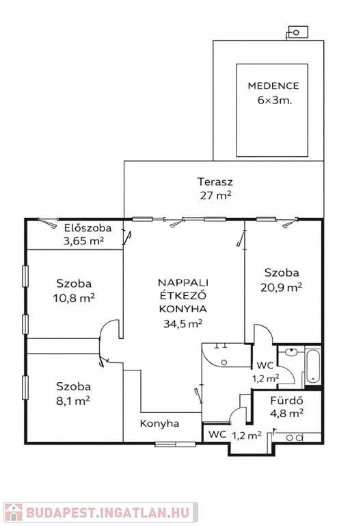 - Szülői háló (nag yméretű) privát fürdőszobával (zuhanyzós), szintén teraszkapcsolattal.