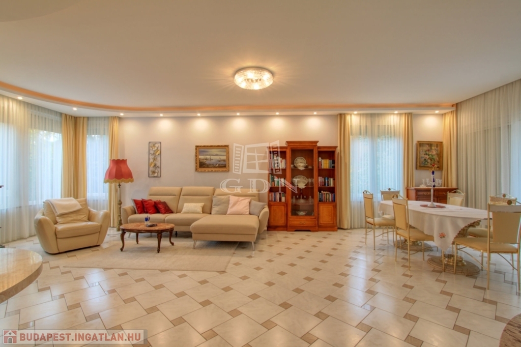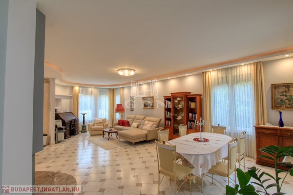 4882. Törökbálint legszebb kertvárosi övezetében a Tükörhegyen, kétlakásos, impozáns enteriőrrel rendelkező, galériás, kiváló állapotú, 7 szobás, riasztóval szerelt, délnyugati fekvésű családi ház garázzsal, hőszivattyús fűtött medencével, parkosított 871 m2-es telken eladó.